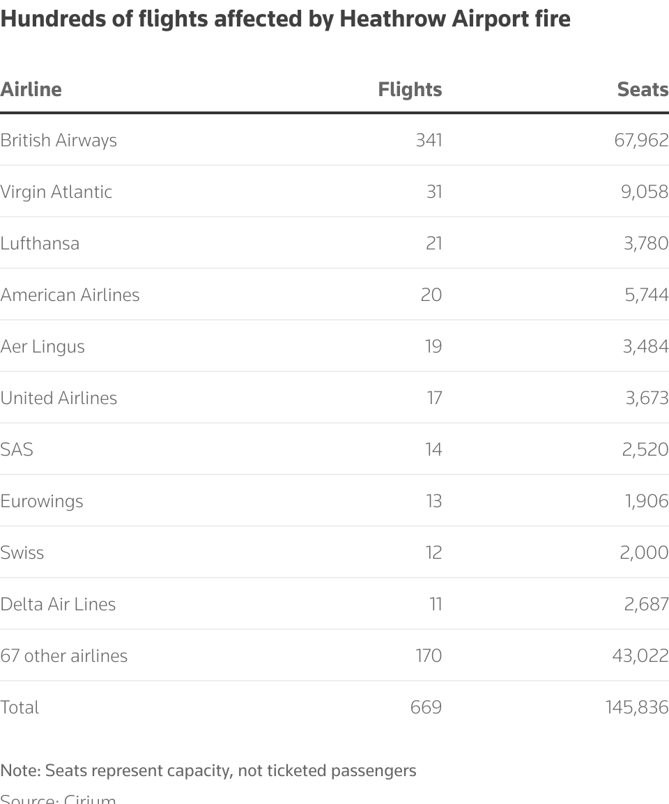 全球航班混乱,伦敦希思罗机场因大火关闭 | 路透社