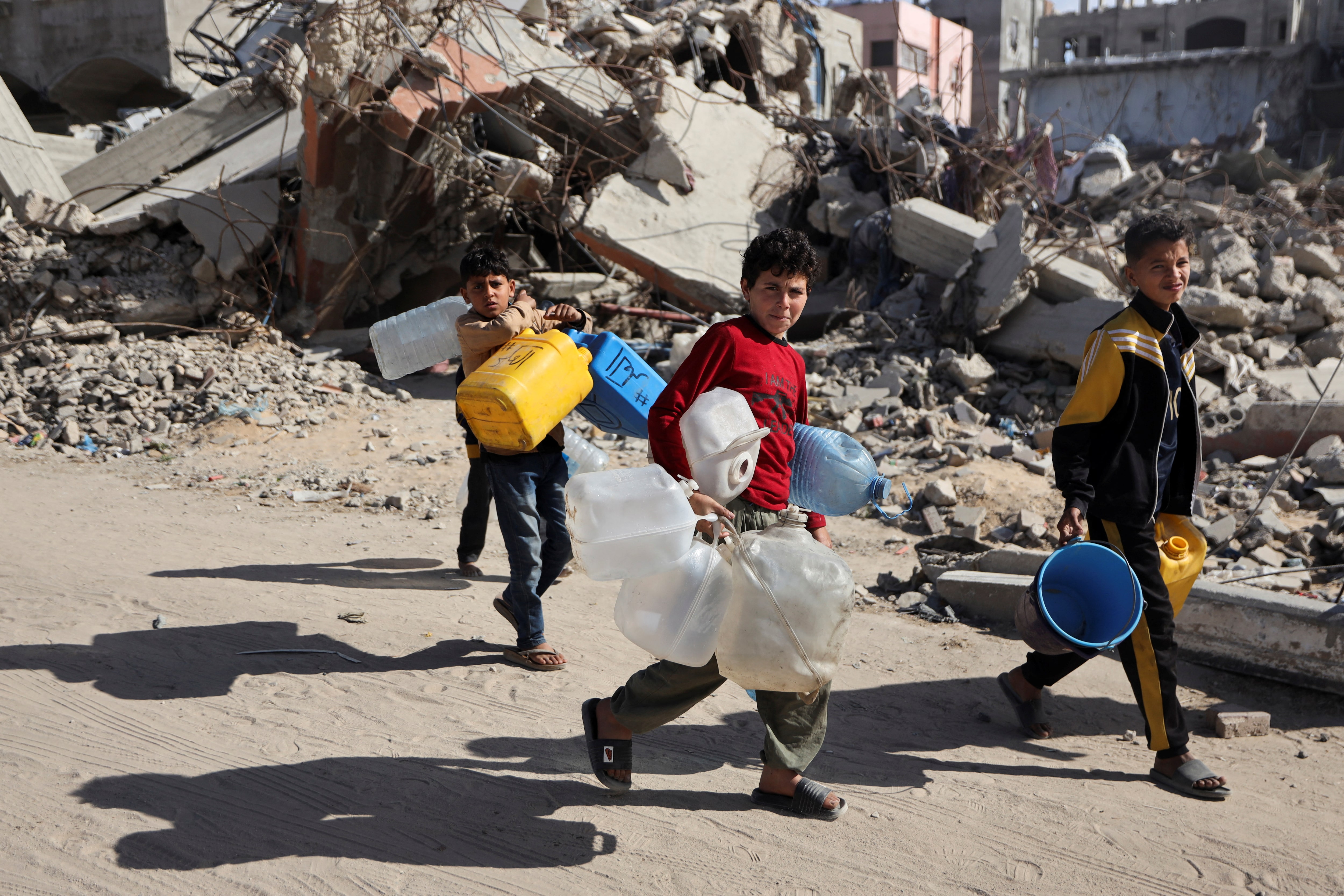儿童们提着容器,巴勒斯坦人在以色列军队对多个社区发布撤离命令后,逃离他们的家园,地点是在2025年3月19日的加沙北部贝特哈农,经过激烈的以色列空袭。路透社/阿卜杜勒·哈基姆·哈立德罗斯补充道:“世界粮食计划署支持的25家面包店中有6家不得不关闭。面包店外的街道上人群更加拥挤。”