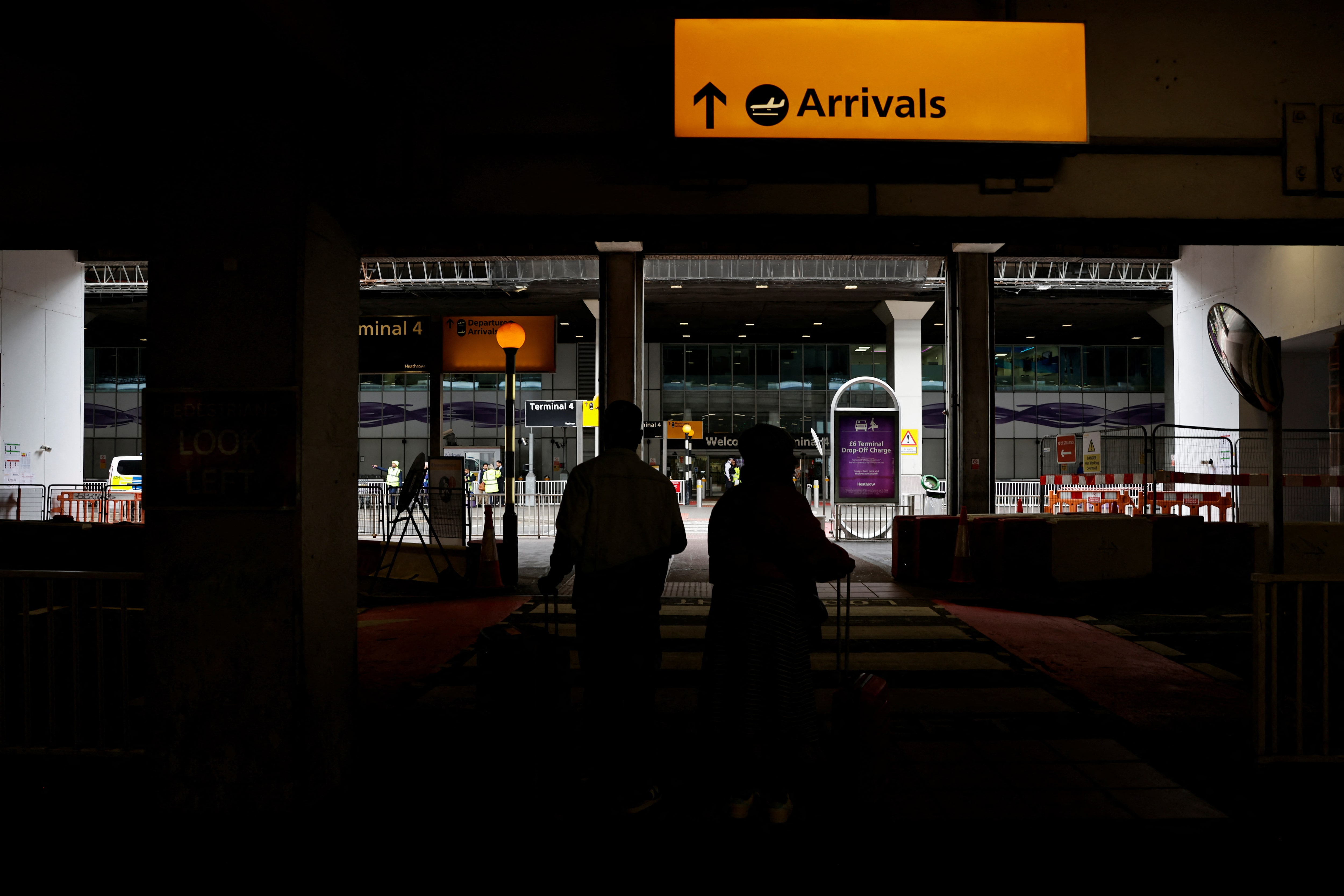 人们在希思罗国际机场的到达标志附近站立,火灾导致附近电力变电站停电,影响了机场,位于英国伦敦,2025年3月21日。路透社/卡洛斯·哈索 “鉴于变电站的位置以及此事件对国家关键基础设施的影响,Met的反恐指挥部现在正在主导调查。”