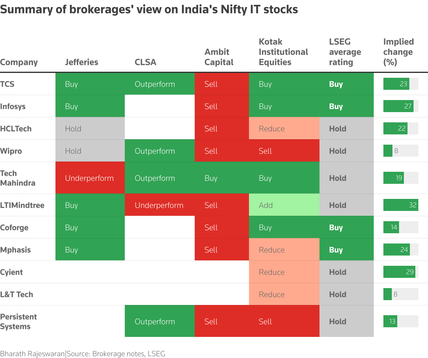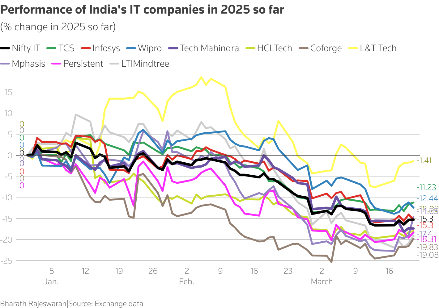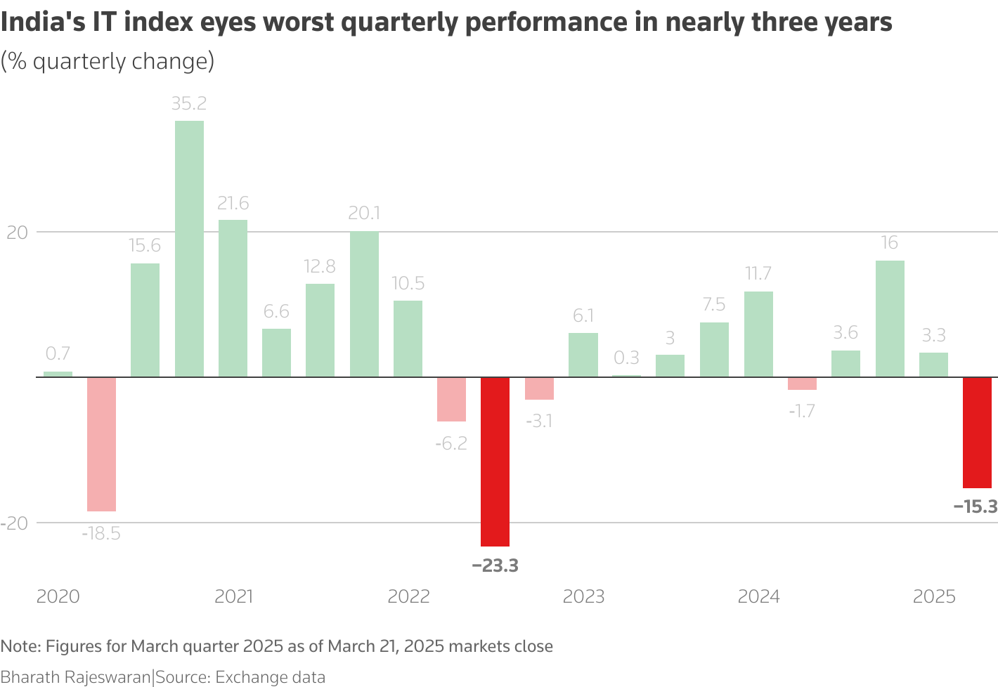 印度的IT指数今年迄今下跌了15.3%,并且有望迎来自2022年6月以来最糟糕的季度。顶尖公司如TCS (TCS.NS)、Wipro (WIPR.NS)、Infosys (INFY.NS) 和HCLTech (HCLT.NS) 今年损失在11.2%到18.1%之间。