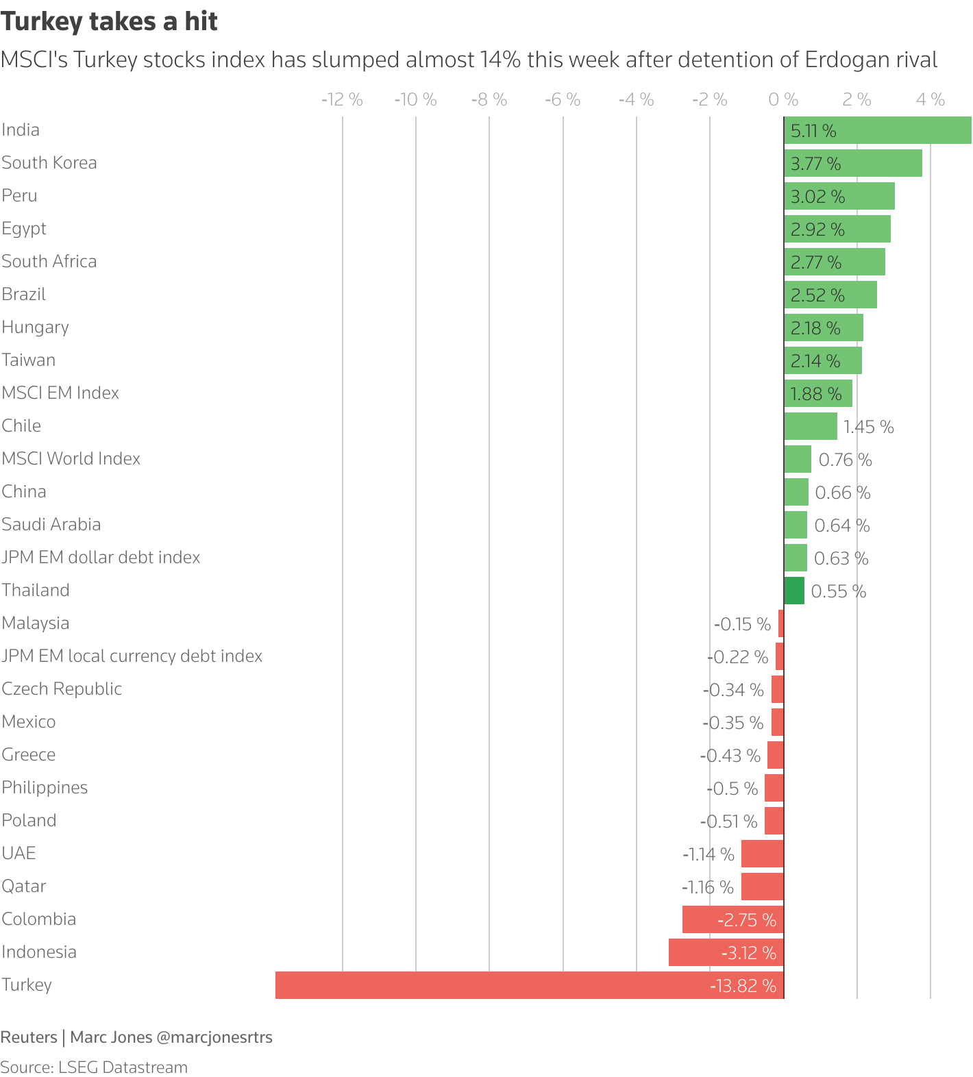 自周三当局 拘留 伊马莫格鲁以来,土耳其的里拉、股票和债券遭受了损失,他被视为埃尔多安的主要政治对手。抗议活动爆发,数千人全国范围内游行。到格林威治标准时间1450时,基准BIST-100指数 (.XU100)交易下跌了7.82%,银行指数下跌了9.37%,在格林威治标准时间0857恢复交易后。基准BIST-100指数正处于15%的周跌幅轨道上——这是自2008年10月全球金融危机以来的最大跌幅。