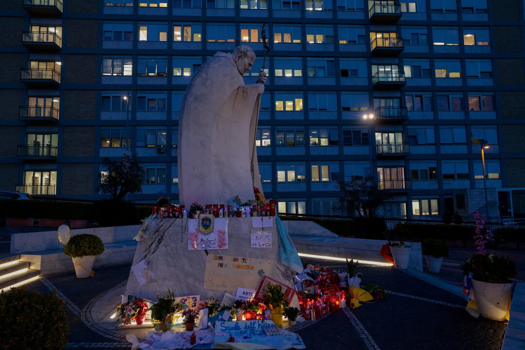 第1项,共5项 一个人在教皇方济各继续住院的当天,在梵蒂冈圣彼得广场举行的祈祷服务上,手持教皇方济各的图像,日期为2025年3月19日。路透社/古利尔莫·曼贾帕内