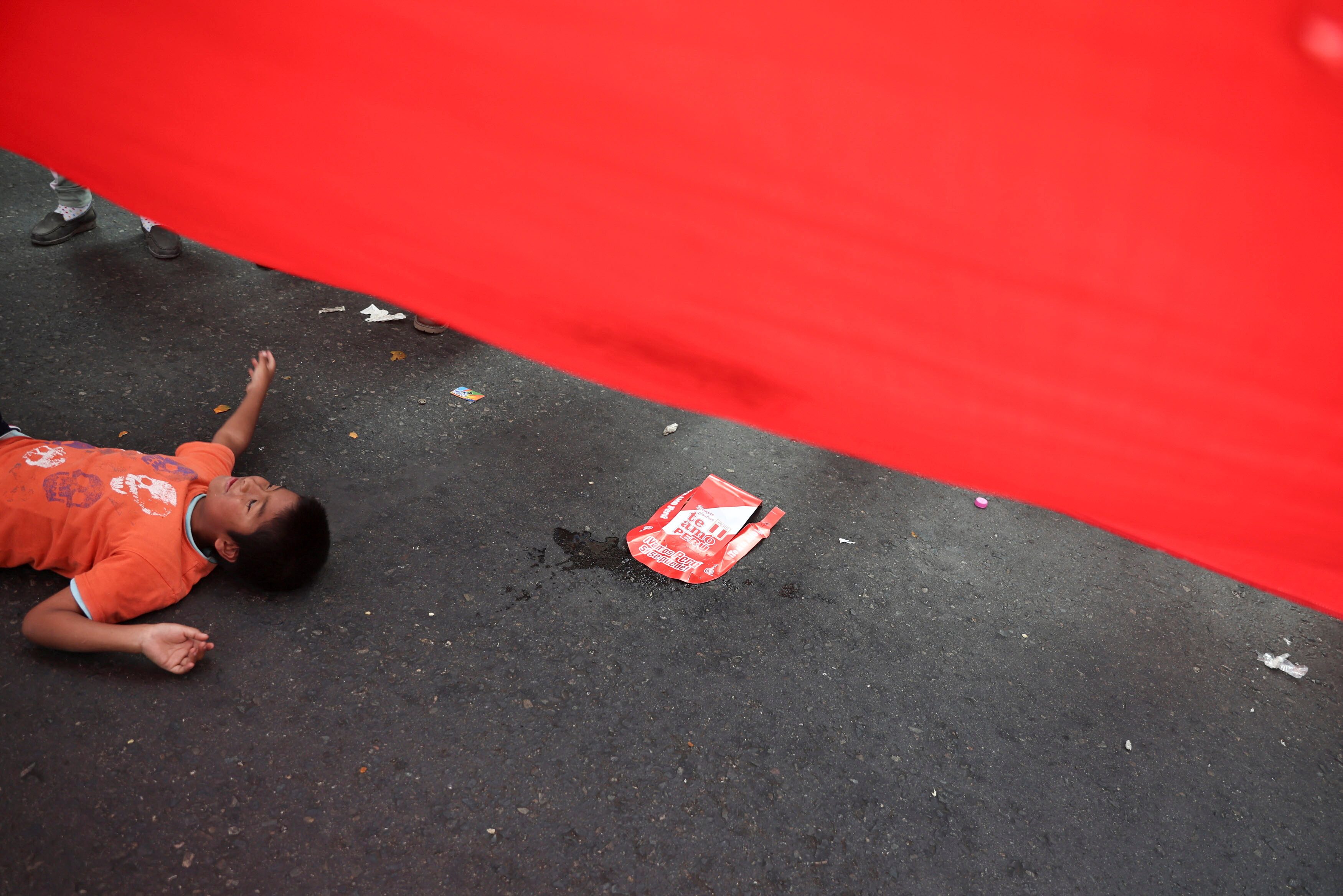 档案照片-一个孩子在国会前的抗议中躺在地上,秘鲁的交通工会为了要求在利马的敲诈和攻击浪潮中获得更大的保护而罢工。2024年10月23日。路透社/塞巴斯蒂安·卡斯坦达利马,3月21日(路透社)- 秘鲁国会于周五罢免了内政部长胡安·何塞·圣蒂瓦涅斯,因为认为该官员没有能力应对该国创纪录的犯罪增加。