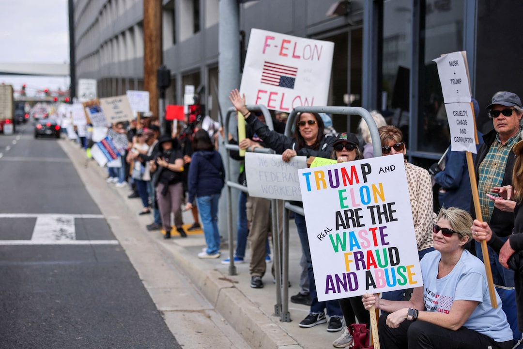 示威者举着写有“把你可怕的手从社会安全上拿开”和“我母亲最好能拿到她的支票!”的标语牌。