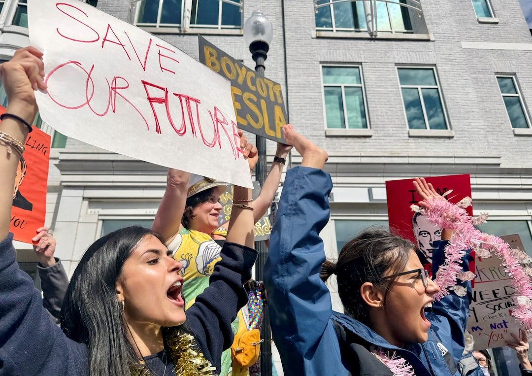 人们在美国华盛顿特区乔治城的特斯拉经销商外抗议埃隆·马斯克,2025年3月22日。路透社/扬·泰西尔抗议者还在其他美国城市,包括洛杉矶,以及国外的城市如多伦多集会,一些加拿大人誓言在特朗普政府提高对加拿大商品的关税后不再购买美国产品。