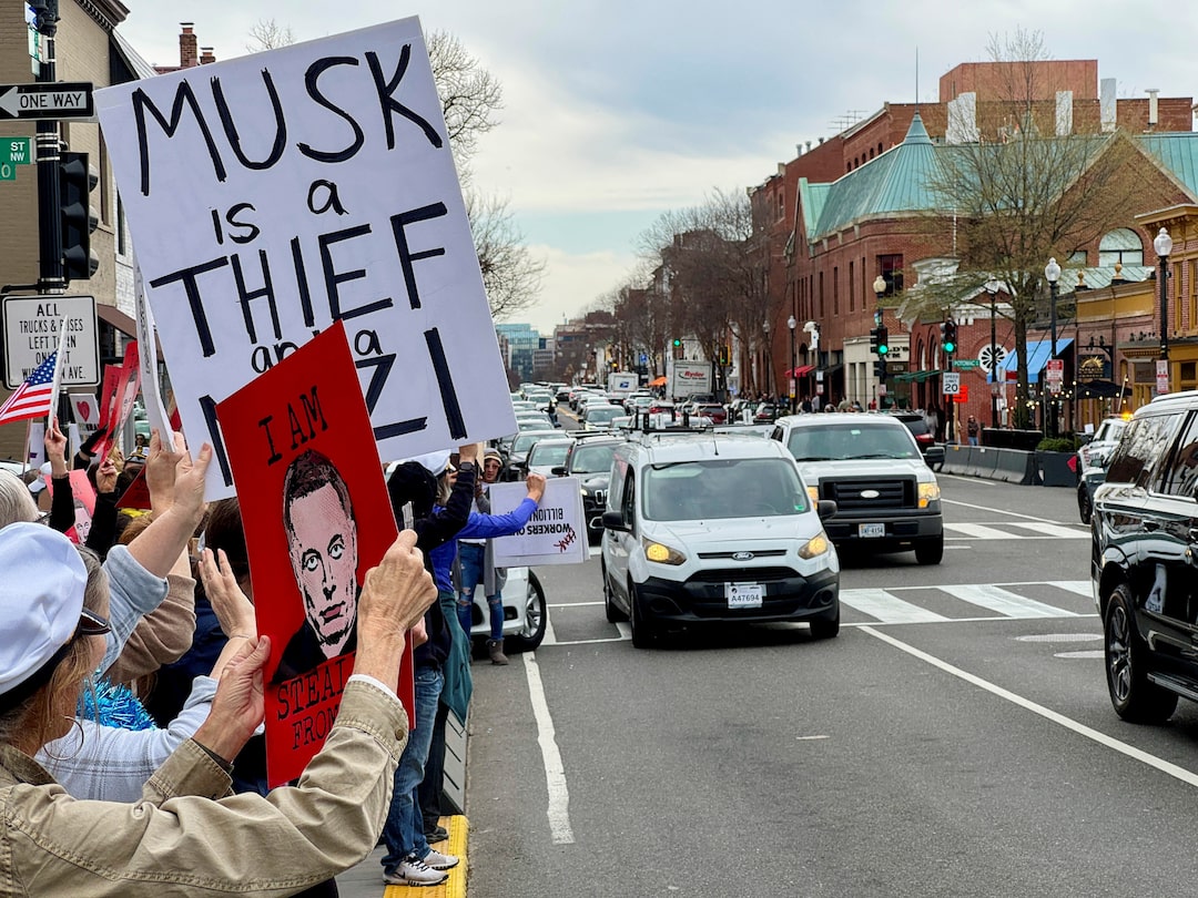 经过示威的汽车鸣喇叭,向抗议者致意,抗议者的标语上有马斯克的照片,他是世界首富。唐纳德·特朗普总统任命马斯克领导削减联邦政府的工作,该政府在国家首都拥有数千名员工。
