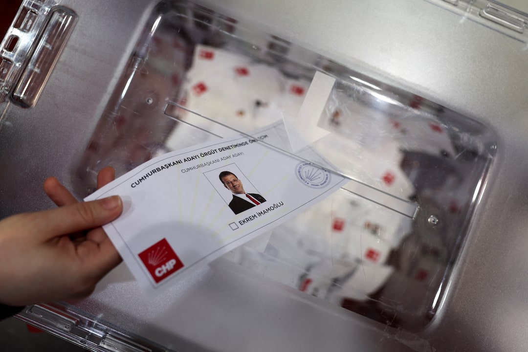 一名选民在土耳其伊斯坦布尔投票支持被监禁的伊斯坦布尔市长埃克雷姆·伊马莫格鲁作为下届总统选举的候选人,时间是2025年3月23日。路透社/乌米特·贝克塔斯 伊斯坦布尔,3月23日(路透社) - 土耳其反对派共和人民党(CHP)成员和其他人于周日前往投票站进行初选,以支持被拘留的 伊斯坦布尔市长埃克雷姆·伊马莫格鲁 作为下届总统选举的候选人。CHP呼吁非党派成员投票,以增强公众对伊马莫格鲁因贪污和协助恐怖组织等指控而被拘留后的抵抗。伊马莫格鲁否认这些指控。