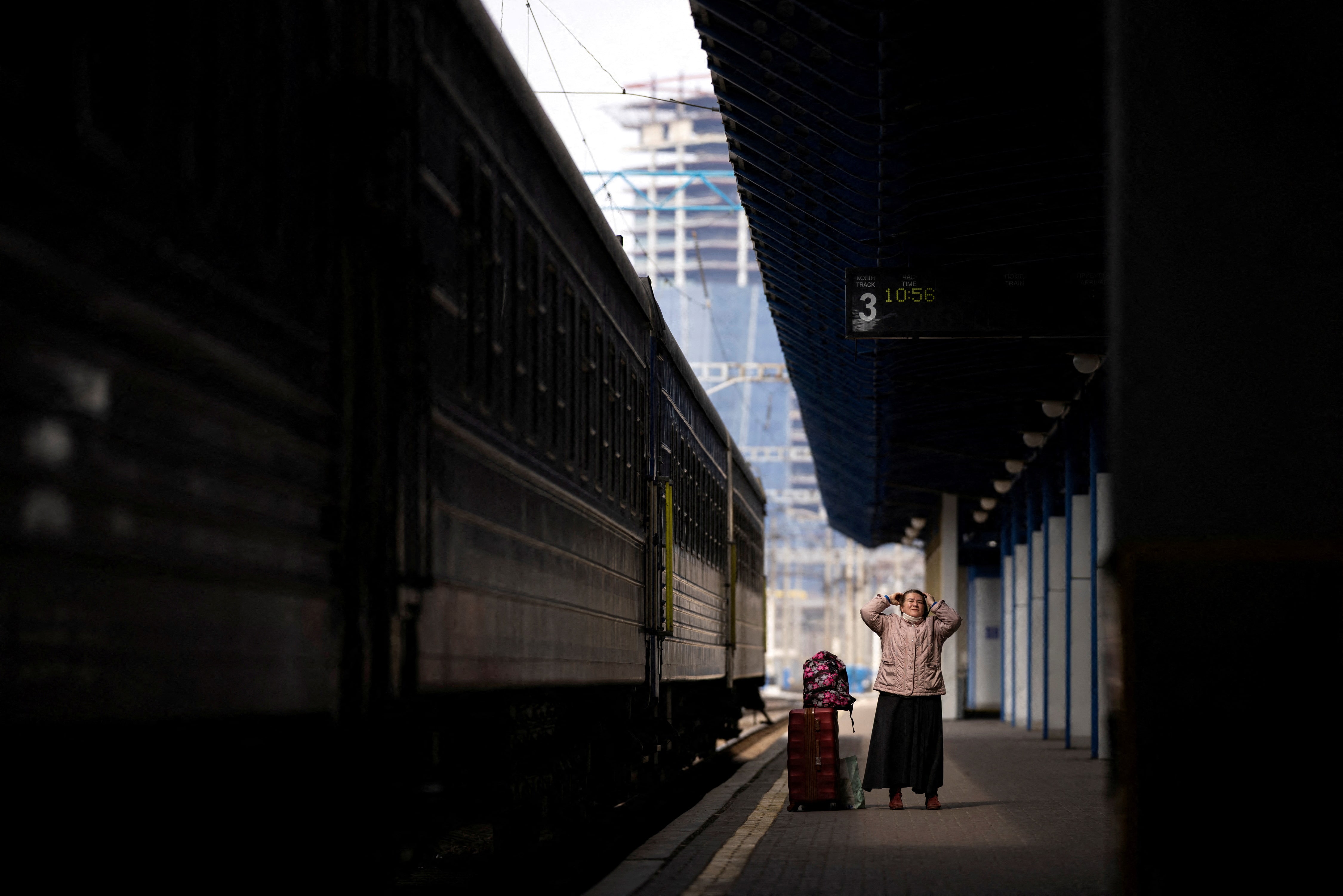 周一早上,基辅中央火车站排起了长队,人们在等待购票。售票处表示,票务仅可用于周二之前的旅行。