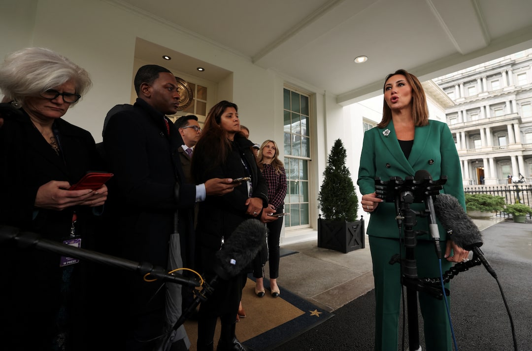 第1项,共5项 总统顾问阿丽娜·哈巴向记者宣布,美国总统唐纳德·特朗普已任命她为新泽西地区的临时美国检察官,地点在美国华盛顿特区的白宫,日期为2025年3月24日。