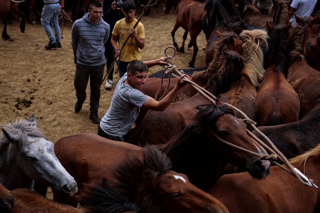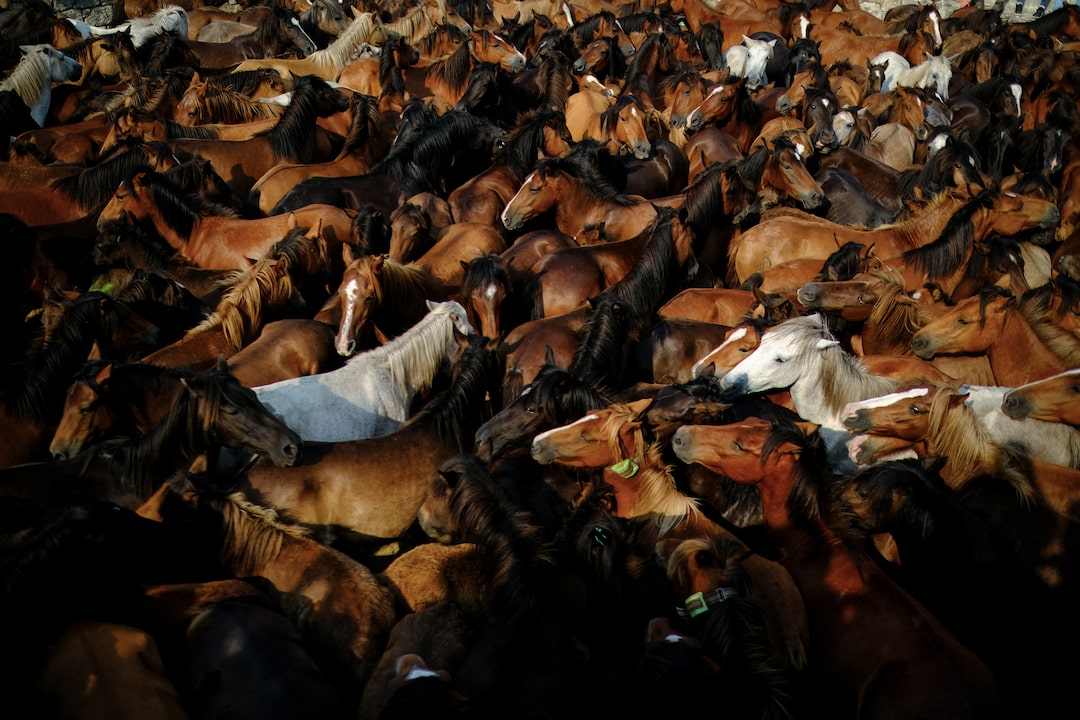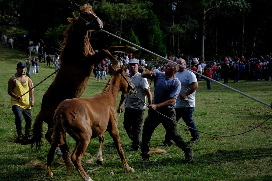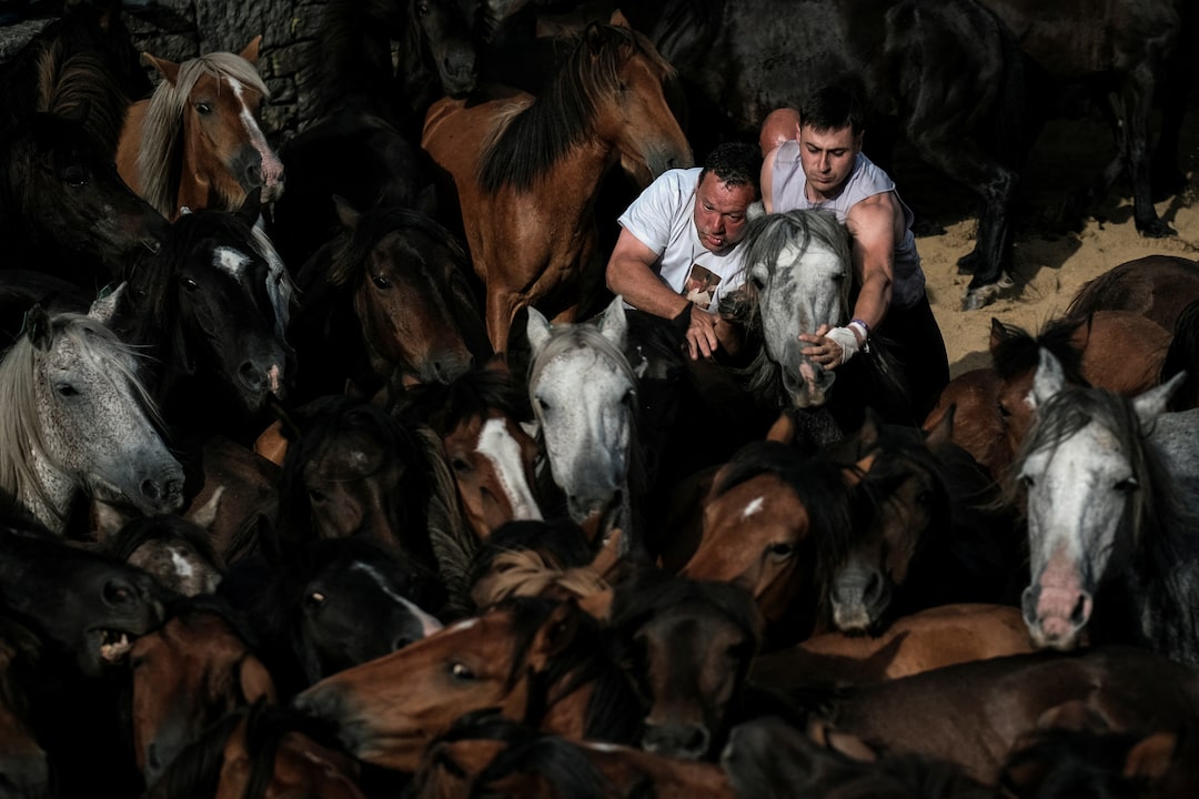 野马在围栏内聚集,在2023年7月8日西班牙加利西亚的萨布塞多村进行“rapa das bestas”或“兽类剪毛”之前,它们会被驱虫并剪去鬃毛。每年夏天,当地人会将该地区大约10,000匹野马聚集起来进行年度… 阅读更多他们每年会举行一次被称为“rapa das bestas”或“兽类剪毛”的活动,以便给马匹驱虫、接种疫苗,并剪去鬃毛,以使狼更难捕捉到它们。