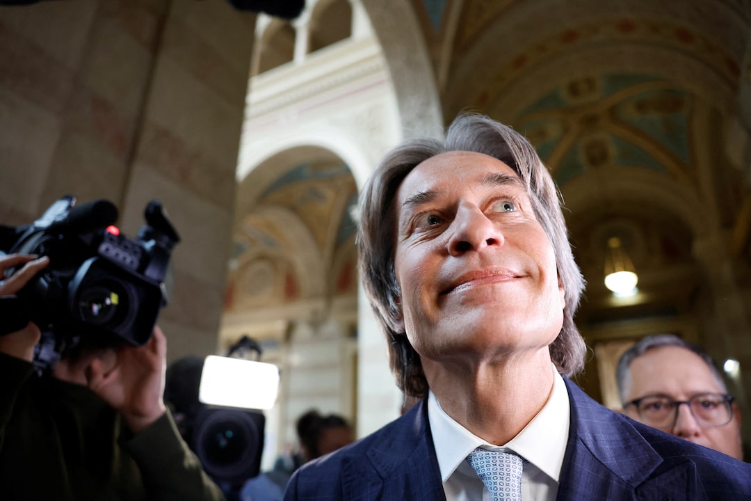 项目 1 共 3 前奥地利财政部长卡尔-海因茨·格拉瑟在2025年3月25日出现在奥地利维也纳高等法院的当天,向媒体发表讲话,身旁是他的律师曼弗雷德·艾因德特和诺伯特·韦斯。路透社/丽莎·洛伊特纳