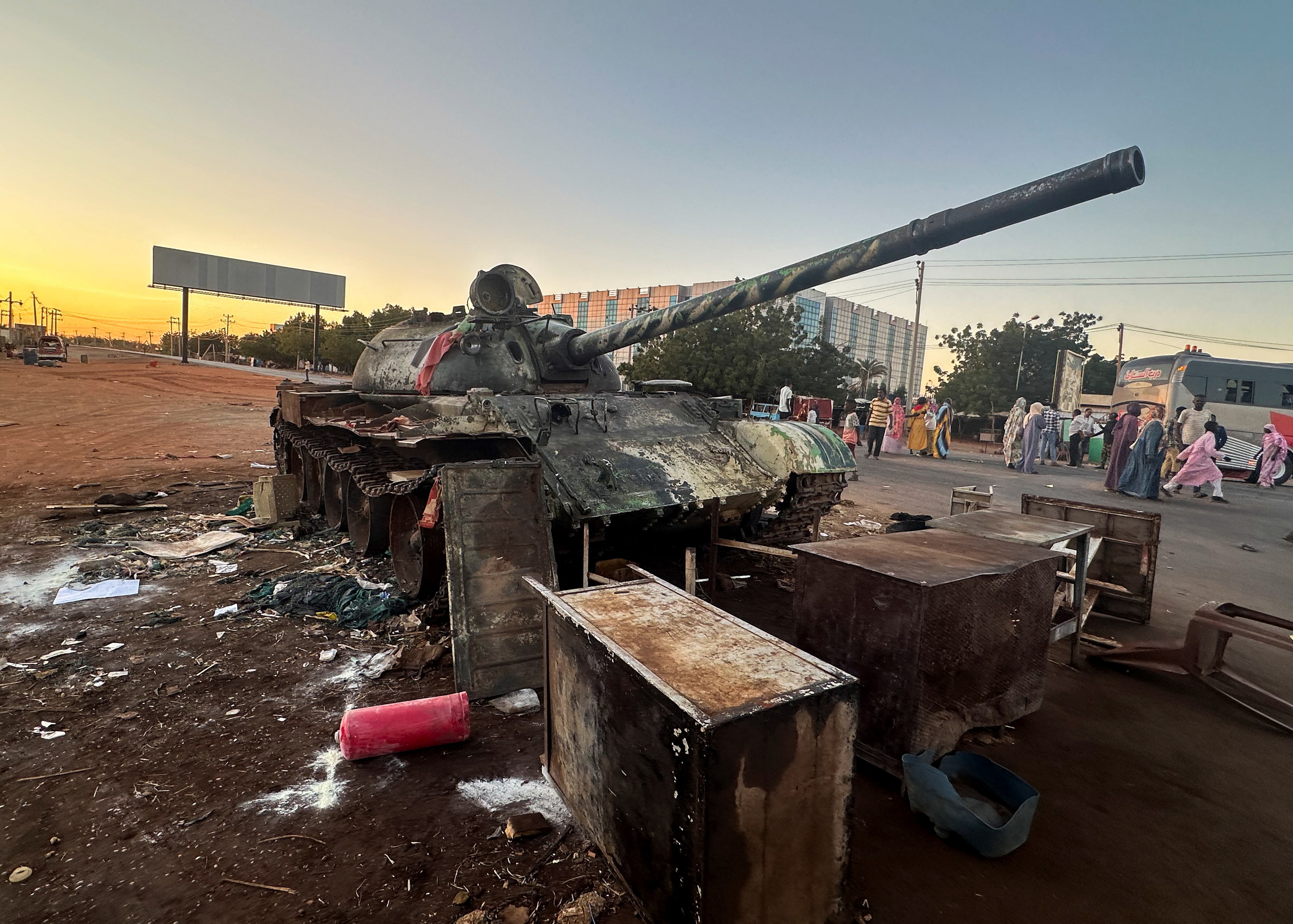 官僚控制的收紧部分是由于RSF对国际合法性的追求,但这也为一个面临军事挫折的派系提供了一种筹集资金的方式,同时仍控制着包括几乎所有达尔富尔在内的大片地区,援助工作者表示。人们在坦克旁站立,苏丹军队于2025年1月12日进入瓦德马达尼,路透社/埃尔·塔耶布·西迪格在战争过程中,战场上的势头在双方依靠本地和外国支持的情况下来回摆动,几乎没有决定性突破的迹象。