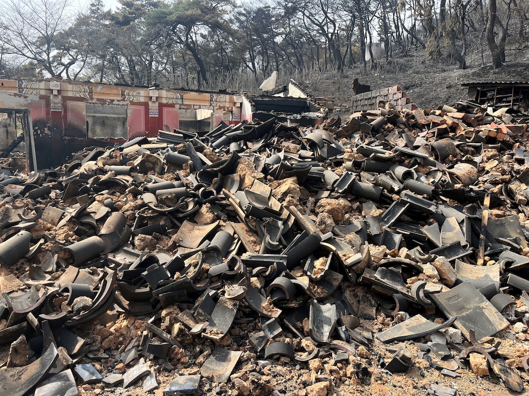 “因为这是如此古老的寺庙,被烧毁实在令人遗憾和心痛,”55岁的佛教徒郑明淑说,她在万岚寺,这是一座有千年历史的寺庙,大部分建筑都被烧毁。