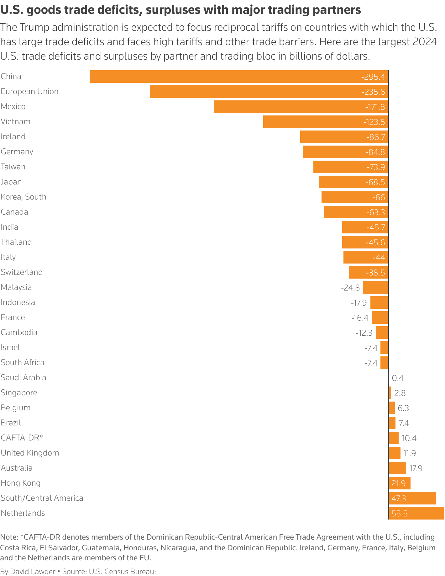 他们没有具体列出这些国家,但根据美国人口普查局的数据,以下贸易伙伴与美国的贸易顺差最大: 中国、欧盟(作为一个整体)、墨西哥、越南、台湾、日本、韩国、加拿大、印度、泰国、瑞士、马来西亚、印度尼西亚、柬埔寨和南非。