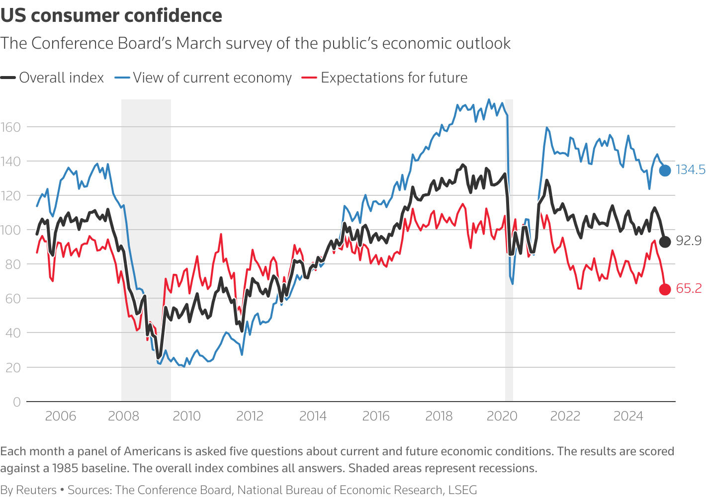 这是一个显示过去20年消费者信心指数的折线图。在三月份,整体指数为92.9,对当前经济的看法为134.5,对未来的预期为65.2。