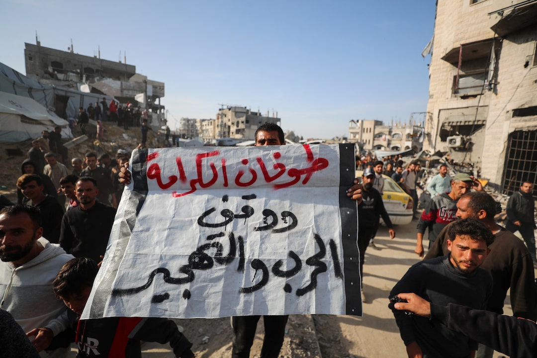 数十万名在战争初期逃往加沙南部的居民在一月停火生效后返回了他们在北部的废墟家园。停火生效。现在,以色列在3月18日重新发起攻势后发布了新的撤离命令。“整个加沙都在废墟中,现在占领者又命令我们离开北部,我们该去哪里?”抗议活动中的目击者说道。