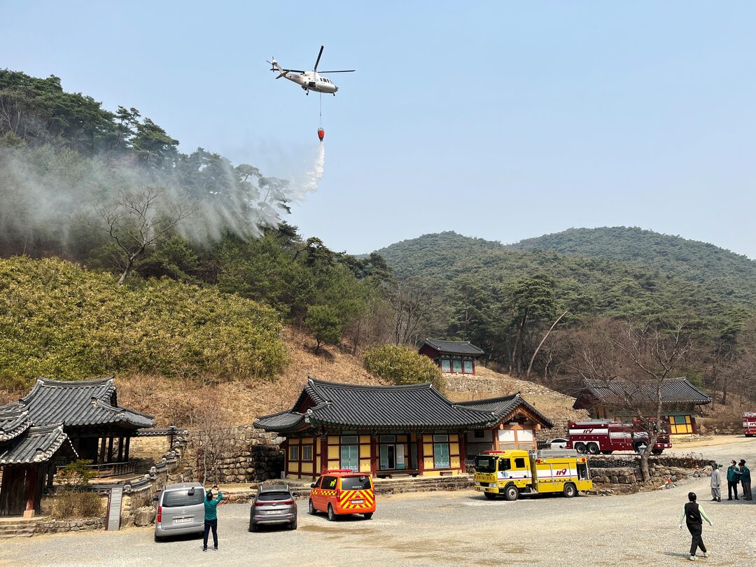 据市政府发言人称,周六和周三爆发的火焰威胁到了多个被联合国教科文组织列为世界遗产的地方,包括安东市的河回村和丙舍孔子学院,同时当局正在喷洒灭火剂以试图保护这些地方。