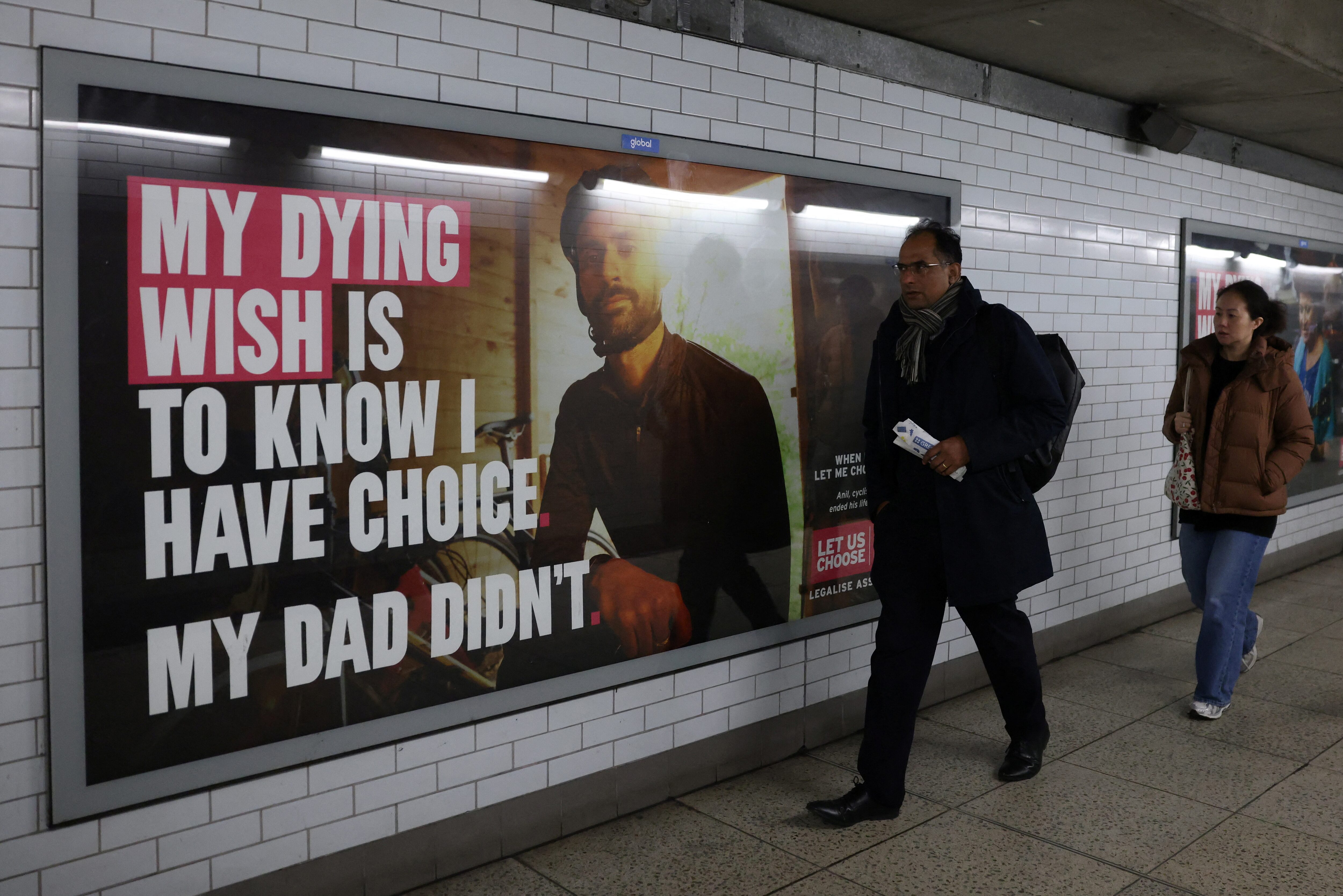 档案照片:行人经过伦敦西敏寺车站的一则呼吁合法化安乐死的竞选广告,2024年11月28日。路透社/霍莉·亚当斯/档案照片伦敦,3月26日(路透社) - 英国针对绝症患者的安乐死法案可能会推迟到2029年,即在即将到来的选举之后,这让该立法的未来充满疑问。