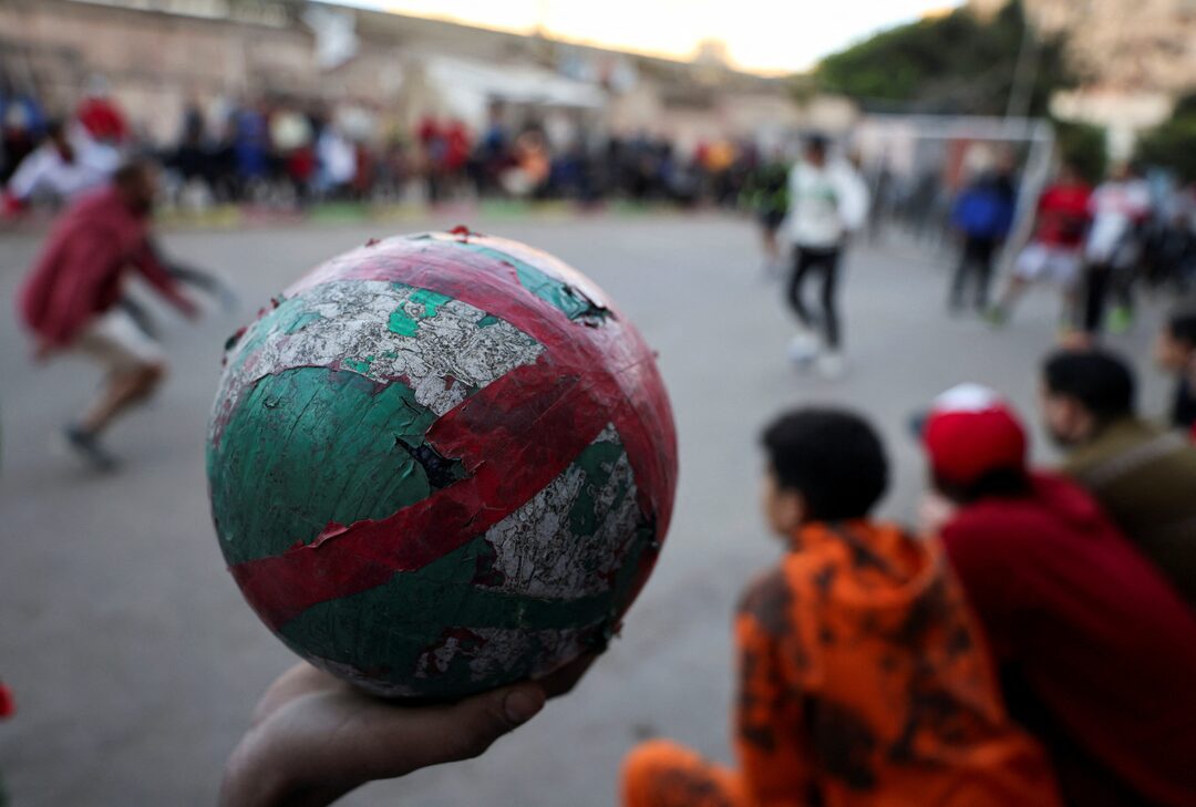多年来,这项游戏不断发展。尽管仍称为袜子球,阿敏解释说,玩家们现在踢的是用胶带和线缝制成小篮球形状的球。