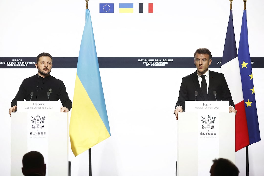 第1项,共6项 法国总统埃马纽埃尔·马克龙与乌克兰总统弗拉基米尔·泽连斯基在法国巴黎的爱丽舍宫举行双边会议后召开新闻发布会,2025年3月26日。YOAN VALAT/Pool via REUTERS