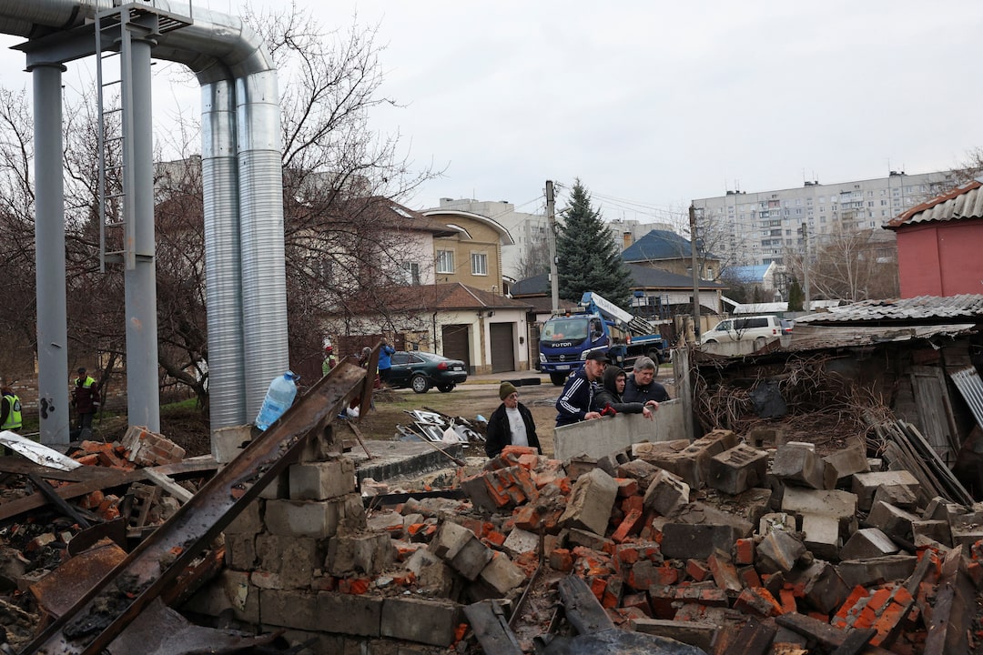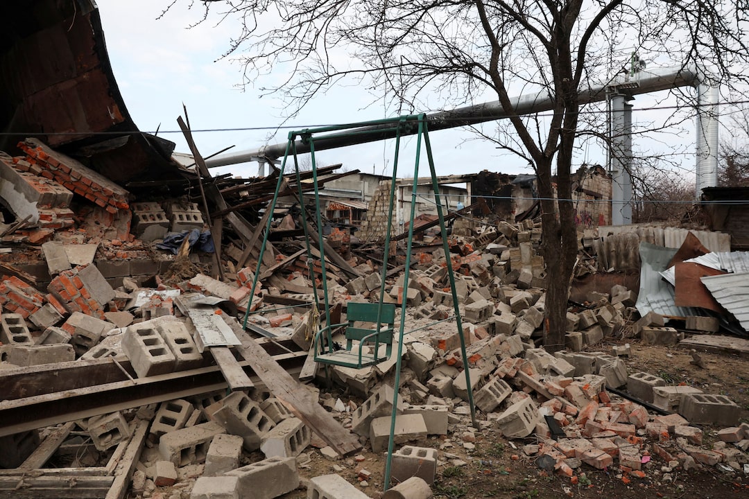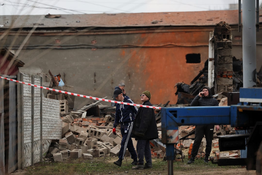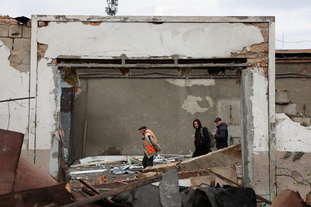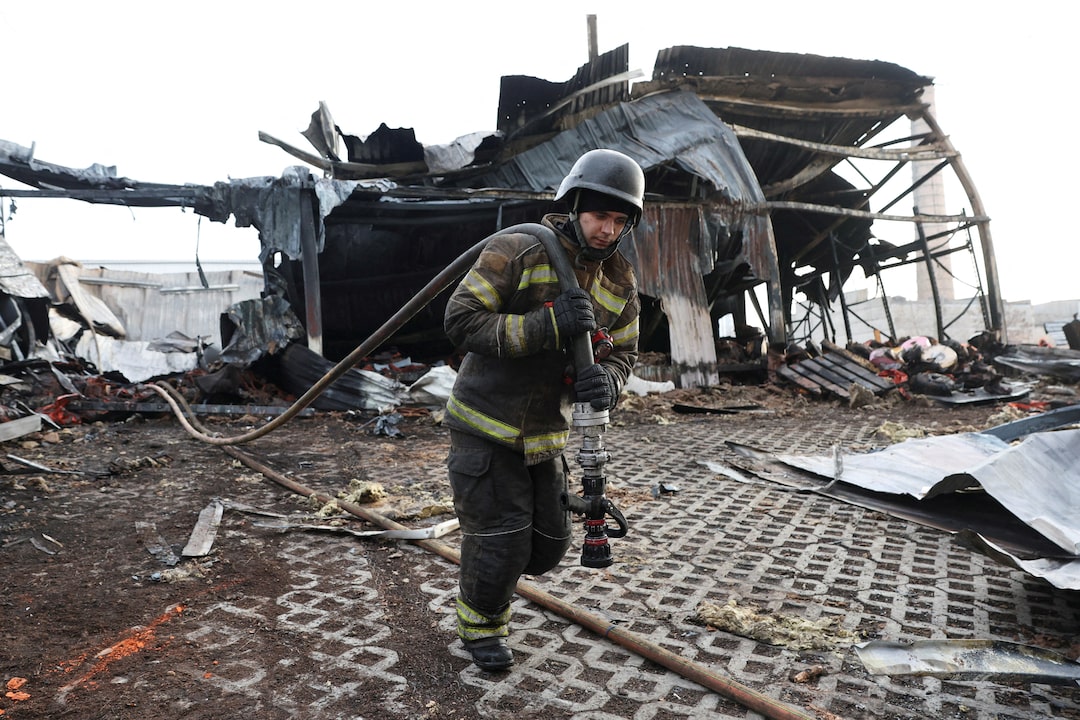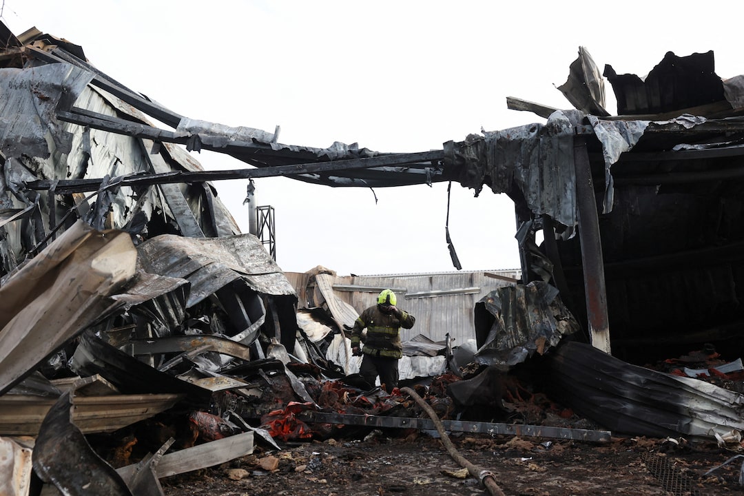 第1项,共10项 一名消防员在乌克兰哈尔科夫的工业区中,俄罗斯无人机袭击造成的焦黑废墟中工作,时间为2025年3月27日。路透社/维奥莱塔·桑托斯·莫拉