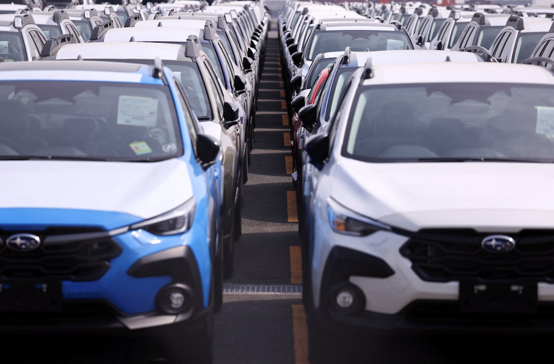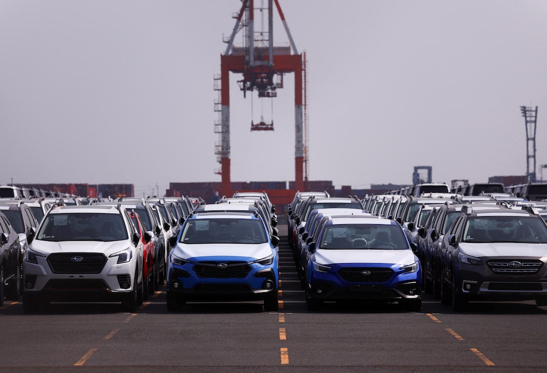 新制造的汽车制造商斯巴鲁的汽车在日本东京南部横滨的一个港口等待出口,2025年3月27日。路透社/伊势佳人日本汽车制造商的股票在周四早盘交易中大幅下跌。