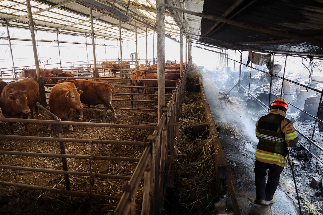 一名消防员在韩国义城的一处部分烧毁的牛场扑灭余火,该地区遭遇了野火的严重破坏,日期为3月27日。 路透社/金洪志 安东,韩国,3月27日(路透社) - 周四,韩国的野火面积较前一天翻了一番,政府称这些火灾是该国最严重的自然火灾灾难,至少造成28人死亡,历史悠久的寺庙被焚毁。