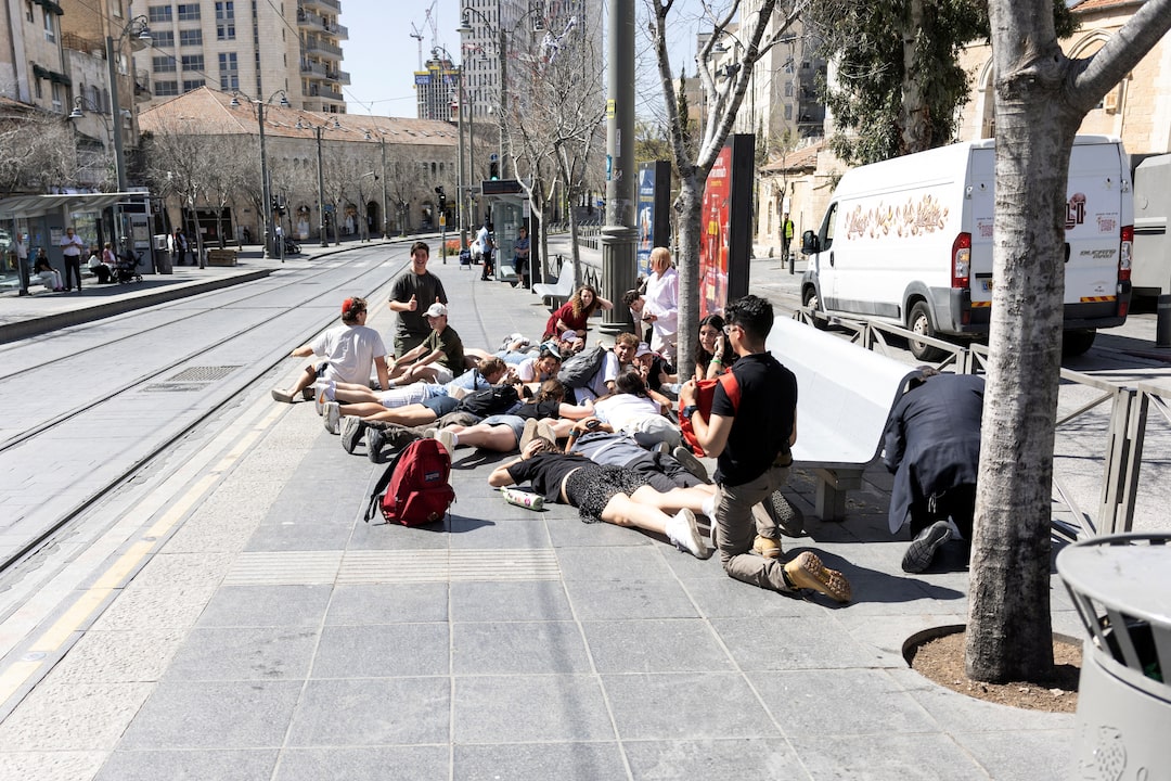 第1项,共4项 人们在耶路撒冷市中心躲避,警报声表明来自也门的导弹袭击,2025年3月27日。路透社/奥伦·本·哈库恩