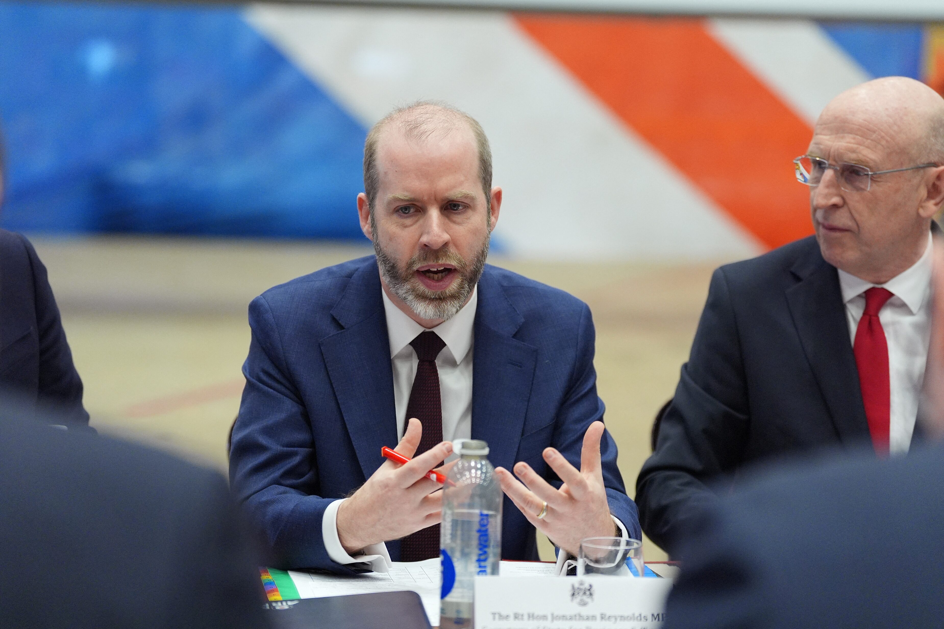 商业秘书乔纳森·雷诺兹在林肯郡的皇家空军瓦丁顿与国防部门举行圆桌会议。2025年2月28日,星期五。Yui Mok/Pool via REUTERS/档案照片伦敦,3月27日(路透社) - 英国商业和贸易部长乔纳森·雷诺兹在周四的一次智库贸易活动上即将发言时,被两名反对对以色列出售武器的亲巴勒斯坦抗议者打断,他们冲上了舞台。