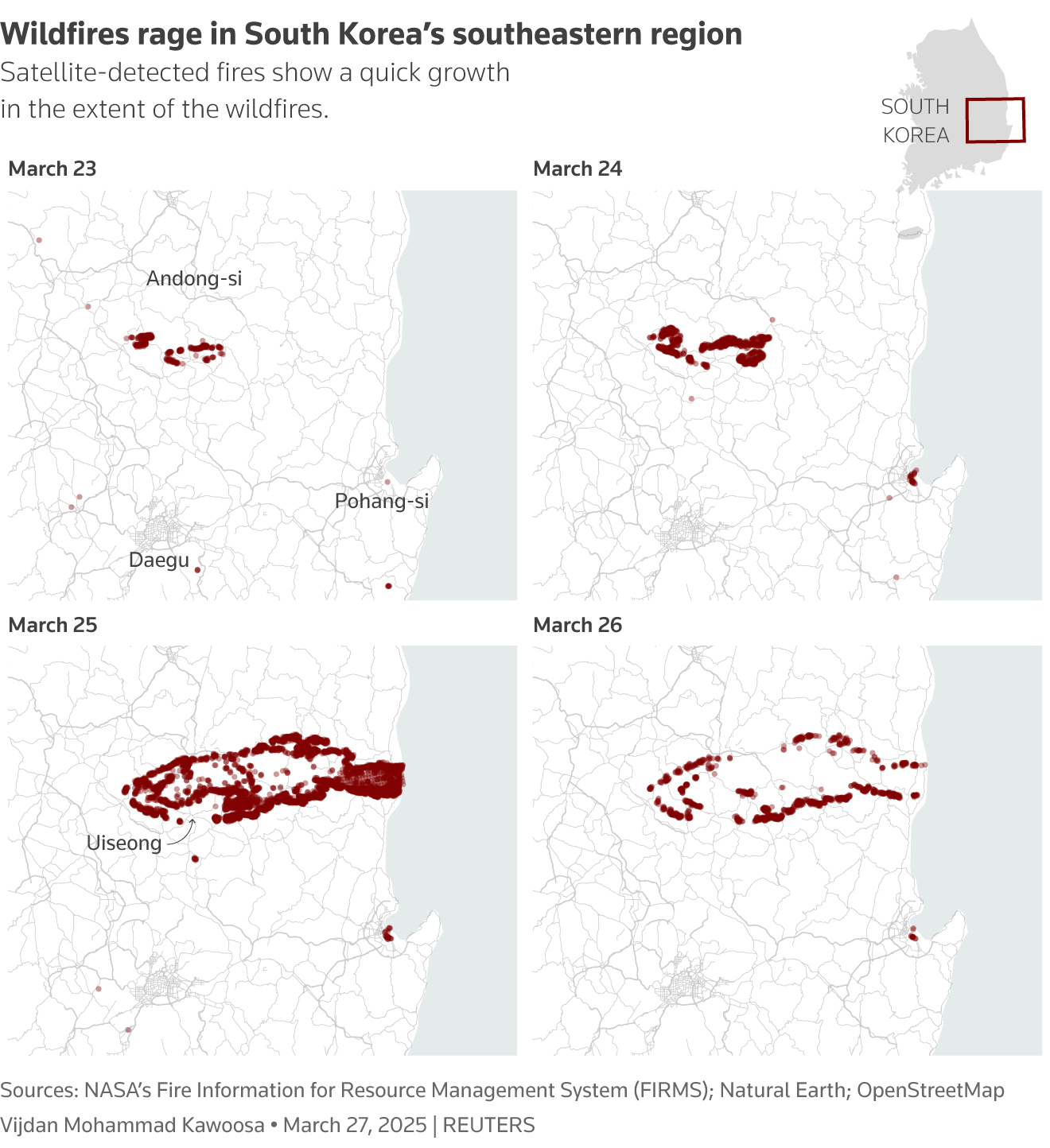安东,韩国,3月27日(路透社) - 周四,席卷韩国的火灾面积较前一天翻了一番,政府将这场自然灾害称为该国历史上最严重的火灾,已造成至少27人遇难和历史悠久的寺庙被焚毁。