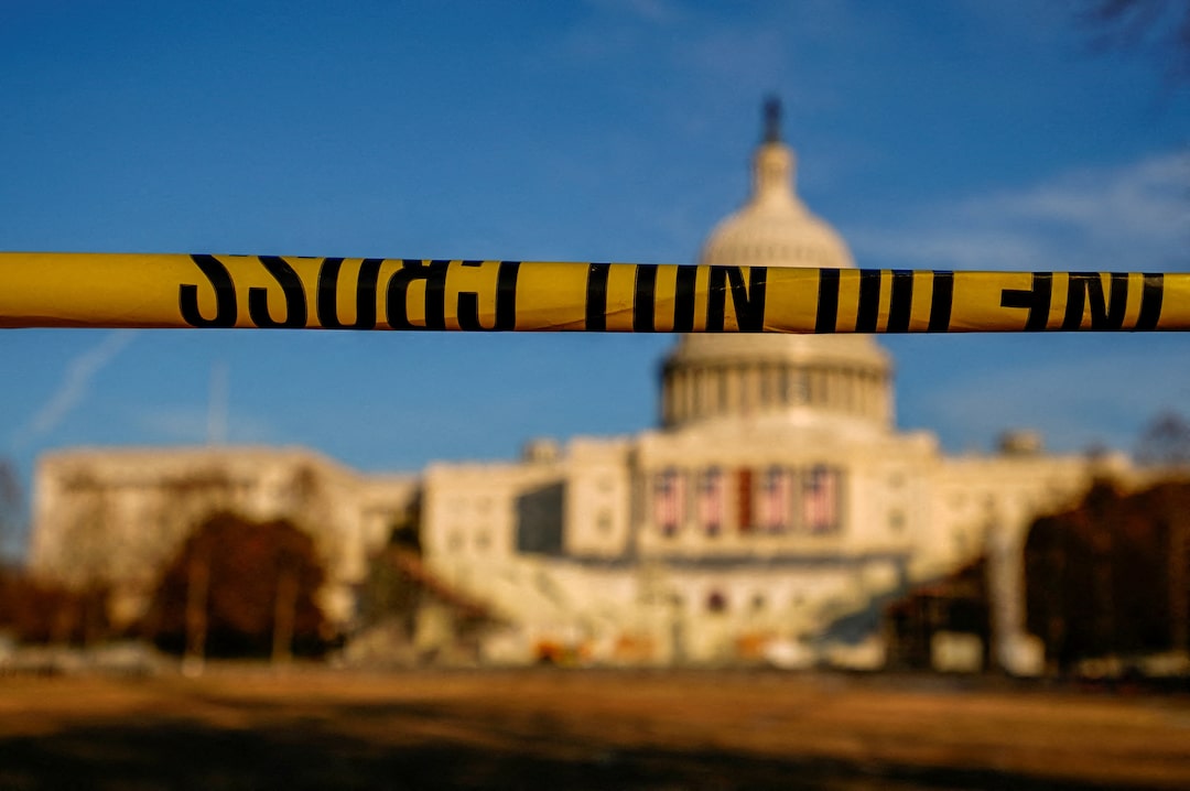 项目1共2项 美国国会大厦在前景中仍有警察封锁线,以阻止公众进入该物业,工人在华盛顿拆除就职典礼的看台,2025年1月26日。路透社/肯·塞德诺/档案照片