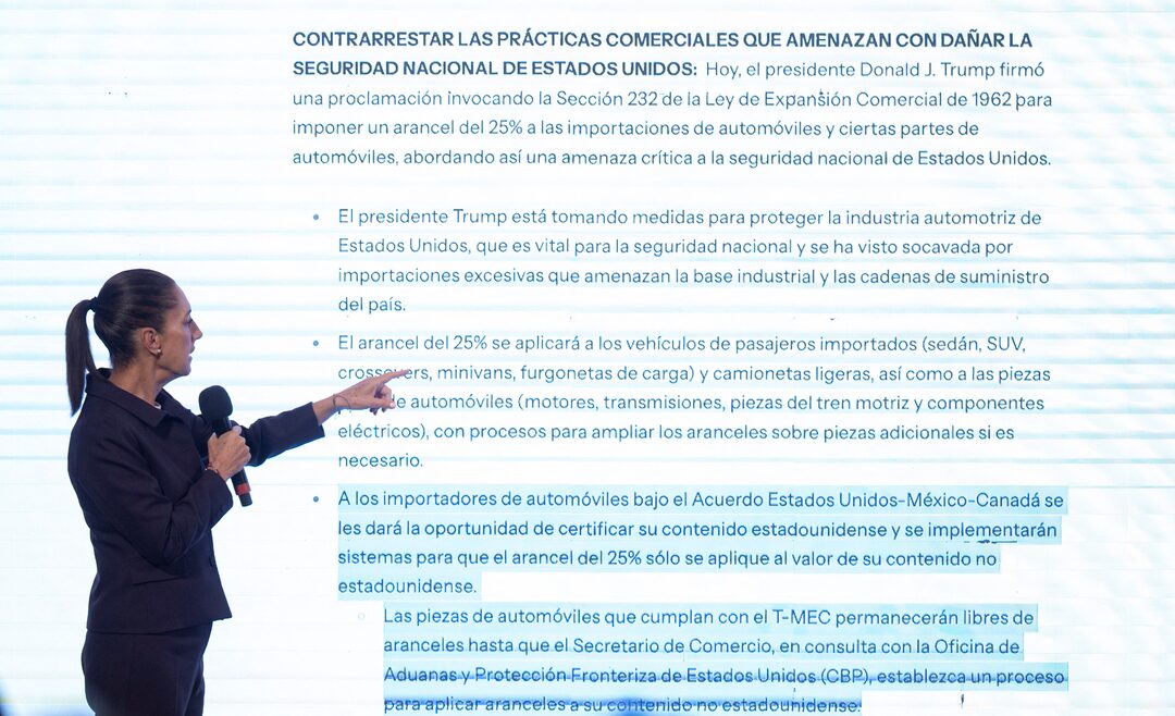 第1项,共4项 墨西哥总统克劳迪娅·谢因鲍姆在墨西哥城举行早间新闻发布会,回应美国宣布对墨西哥汽车行业征收关税的消息,时间为2025年3月27日 墨西哥总统办公室/路透社提供