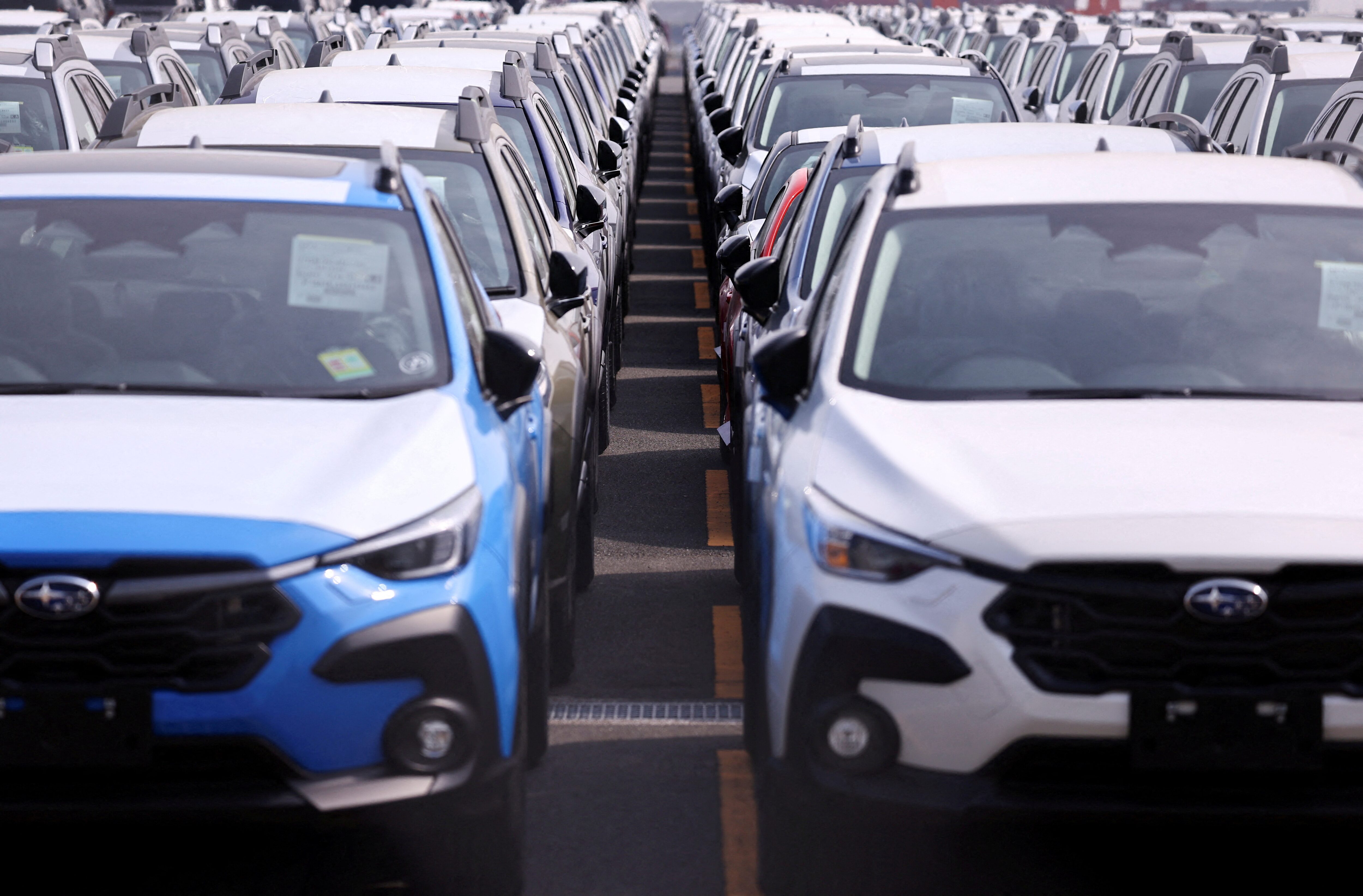 准备出口的斯巴鲁新车在日本横滨港。2025年3月27日。路透社/伊势加藤纽约,3月27日(路透社) - 全球股市下跌,黄金在周四创下历史新高,此前美国总统唐纳德·特朗普最新的关税将贸易战扩大到汽车进口。