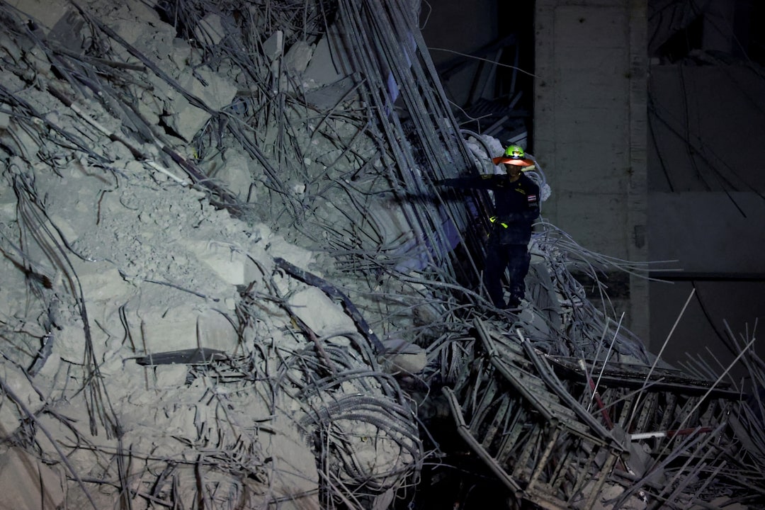 第1项,共10项 一名救援人员在一栋因强烈地震而倒塌的建筑物现场寻找伤亡者,地震监测服务表示,周五在缅甸中部发生的地震也影响了曼谷,泰国首都的人们在震动后惊慌地涌出建筑物,地点在泰国曼谷,2025年3月28日。路透社/阿提特·佩拉旺梅塔