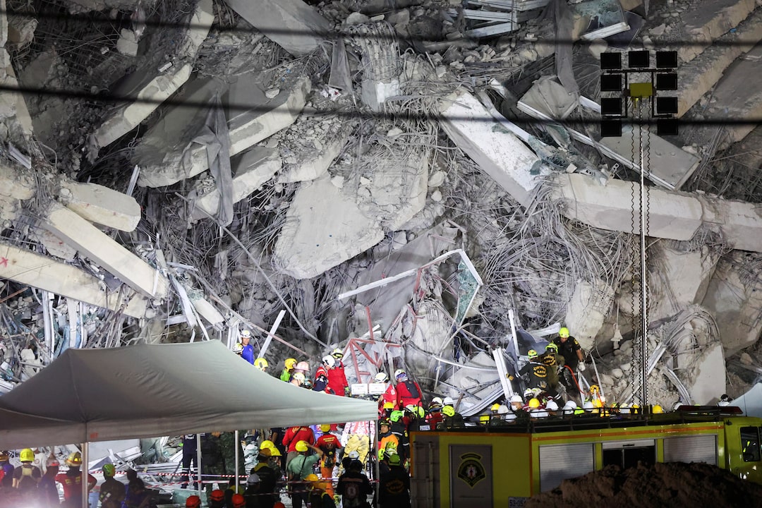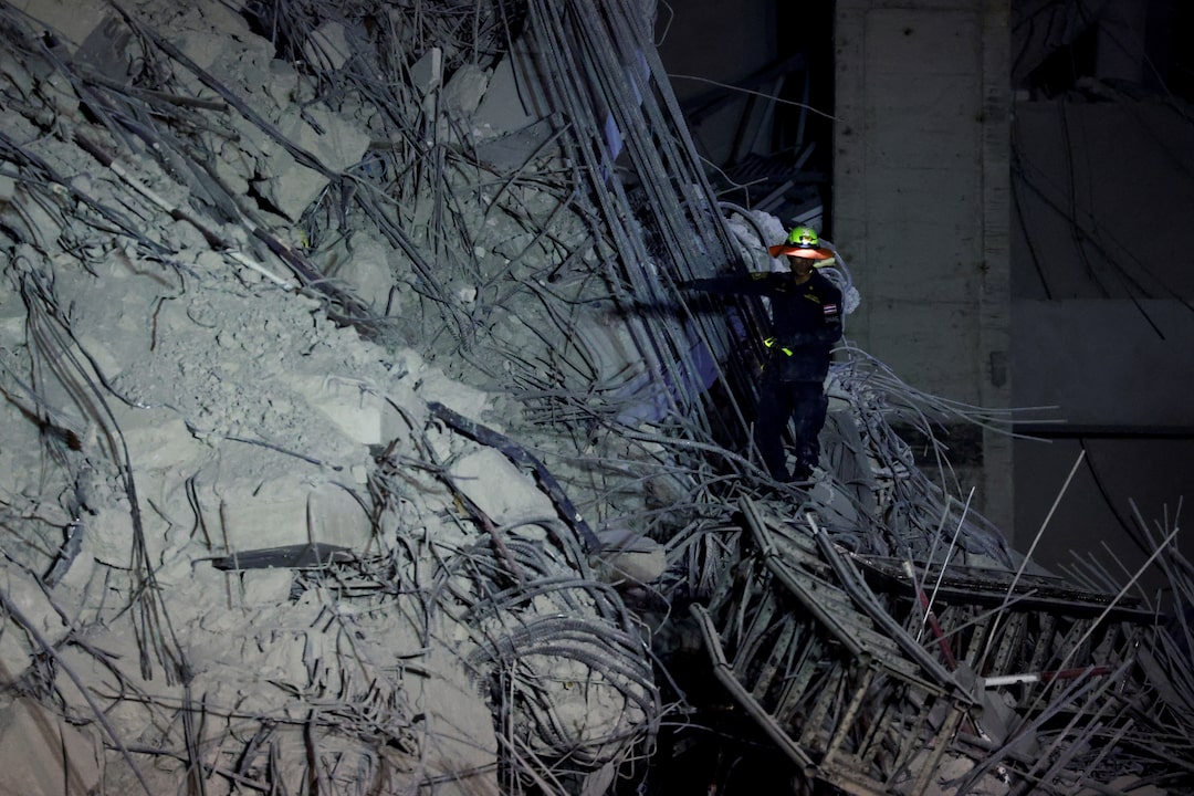 救援人员在缅甸中部因强烈地震而倒塌的建筑物现场工作,地震监测服务报告称,该地震也影响了曼谷。2025年3月28日。路透社/Athit Perawongmetha曼谷,3月28日(路透社)- 周五,一场强烈地震在缅甸造成至少140人遇难,官方称,建筑物倒塌,基础设施在广泛区域受到破坏,包括邻国泰国的一座在建摩天大楼。