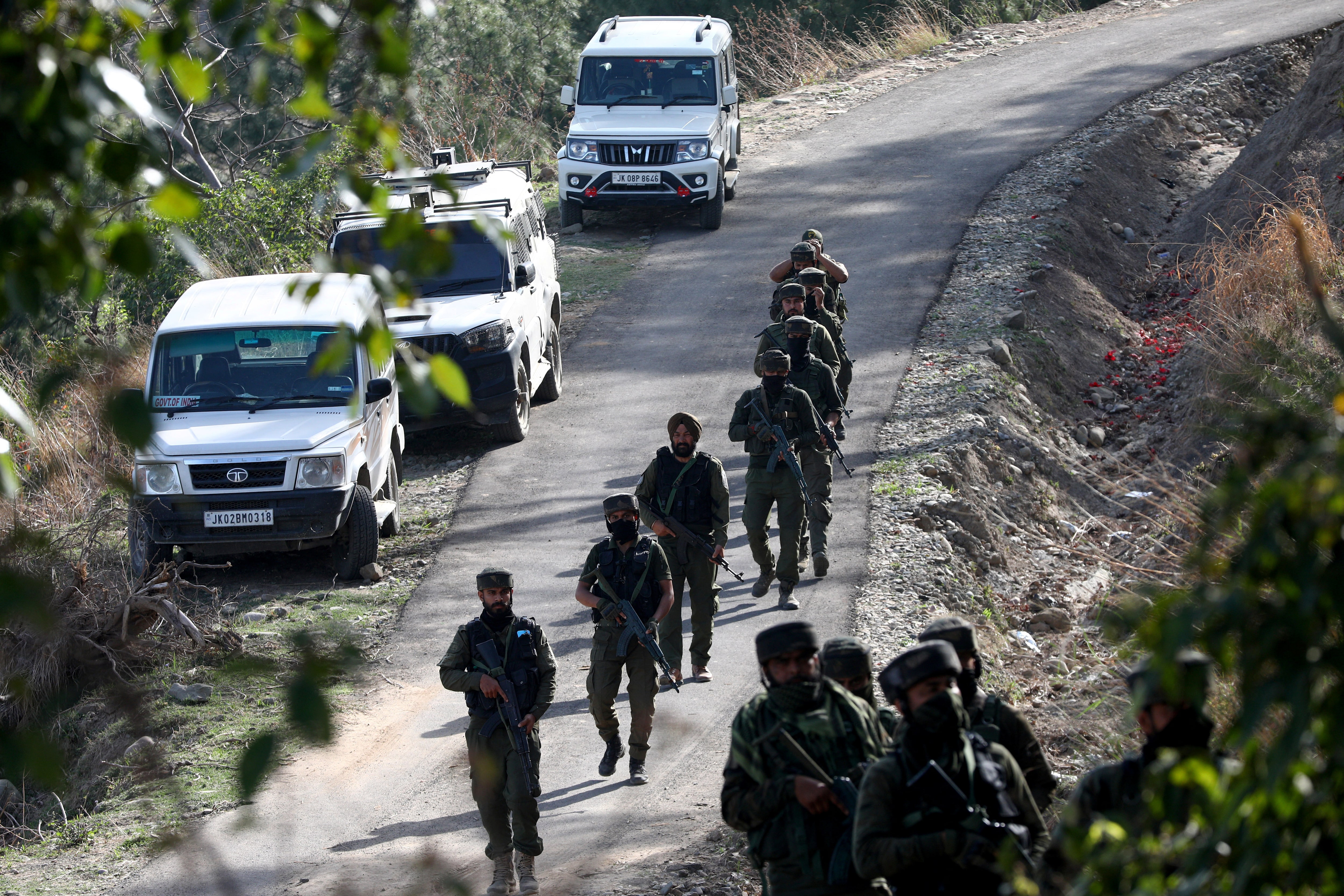 印度安全部队人员在查谟和克什米尔的卡图阿地区一处与疑似武装分子的枪战现场附近巡逻,2025年3月28日。路透社/记者斯利那加,3月28日(路透社)- 一名官员周五表示,在印度动荡的查谟和克什米尔地区,一场枪战中至少有四名警察和两名武装分子被杀,军队正在搜寻当地居民在周日目击到的重武装人员。