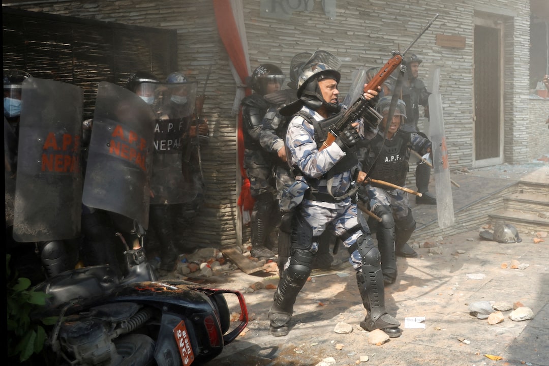 周五的骚乱发生在数千名示威者中,一些人举着尼泊尔国旗,投掷石块并试图突破路障,以便向加德满都中心的国会大楼进发。