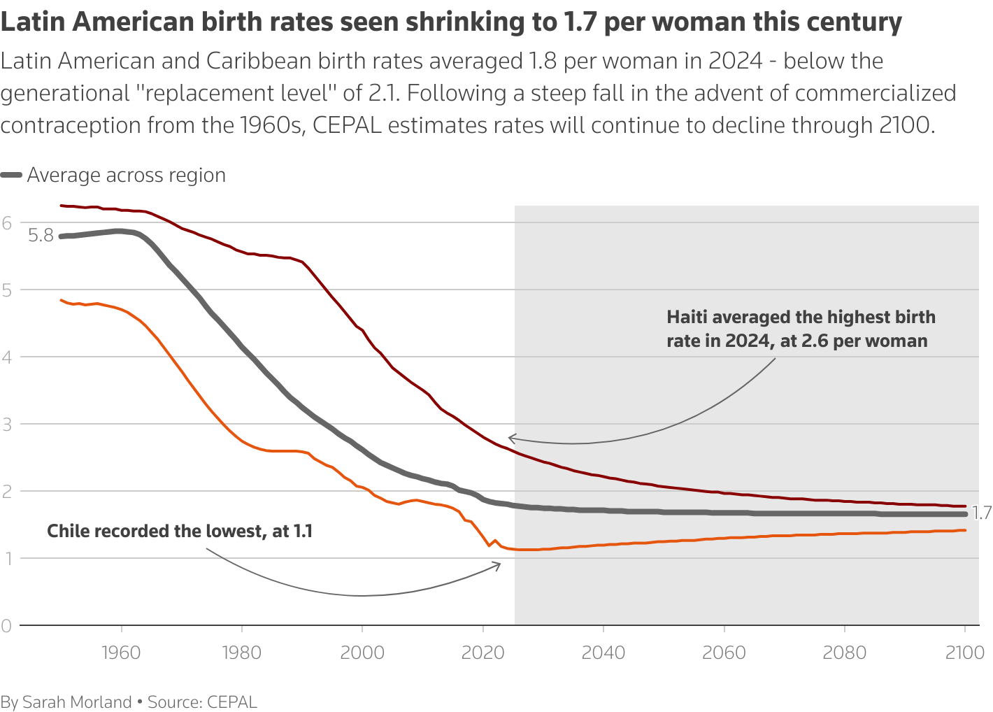 自1960年代避孕措施广泛可用以来,全球出生率一直在下降,CEPAL和联合国妇女署的专家将拉丁美洲更陡峭的下降归因于当局未能解决家庭暴力和为准母亲提供支持。