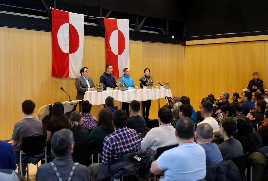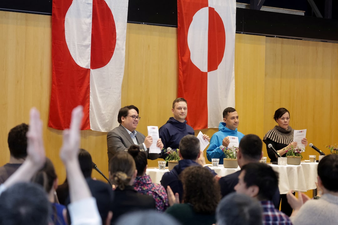 第1项,共3项 民主党(Demokraatit)党领袖和格林兰新任总理延斯-弗雷德里克·尼尔森,格林兰总理和IA党领袖穆特·B·埃格德,西穆特党主席维维安·莫茨费尔特,以及阿塔苏特党领袖阿夸卢·耶里米亚森出席在格林兰努克举行的签署联合协议的仪式,日期为2025年3月28日。路透社/莱昂哈德·福格尔