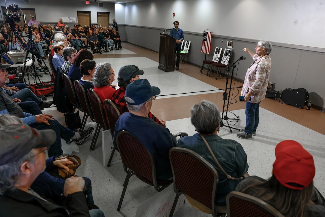 那里有共和党选民,还有独立选民和民主党人。当一个音响师在房间前面摆弄麦克风时,后面有人喊道:“他们不会来吧?”