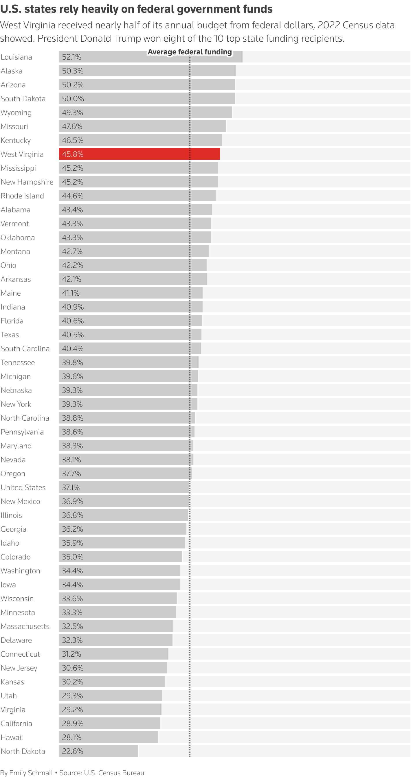 一张条形图显示了各州预算中来自联邦政府的百分比。根据这一指标,西弗吉尼亚州是第八大联邦资金接受者。