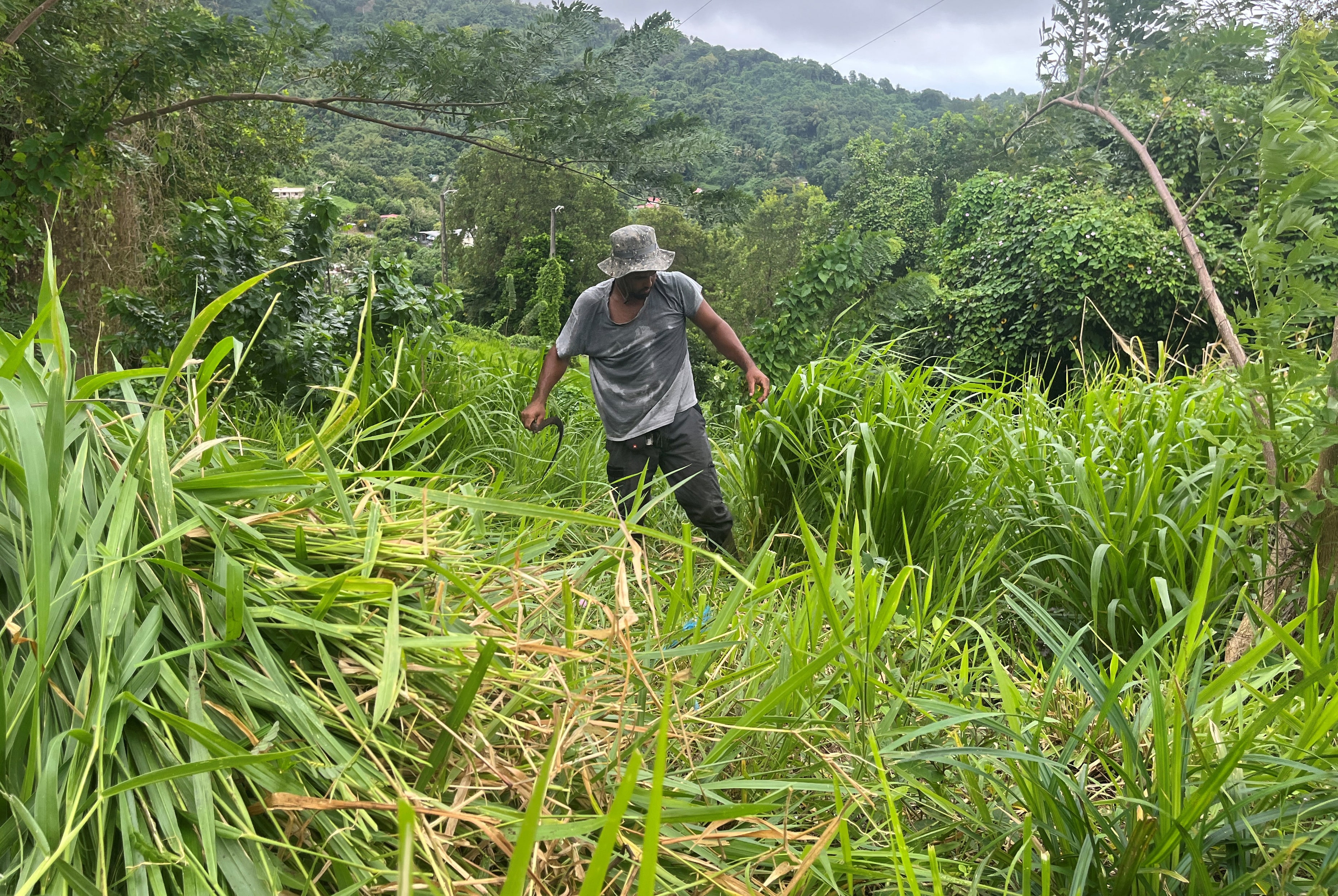 农民杰里克·维尼图斯,38岁,在2025年1月24日于法属加勒比岛马提尼克的勒沃克兰租用的土地上割草喂养他的动物。路透社/莱莉·福鲁迪几乎一半的农田种植糖料以生产朗姆酒或香蕉用于出口,这种情况得到了欧洲补贴的鼓励。