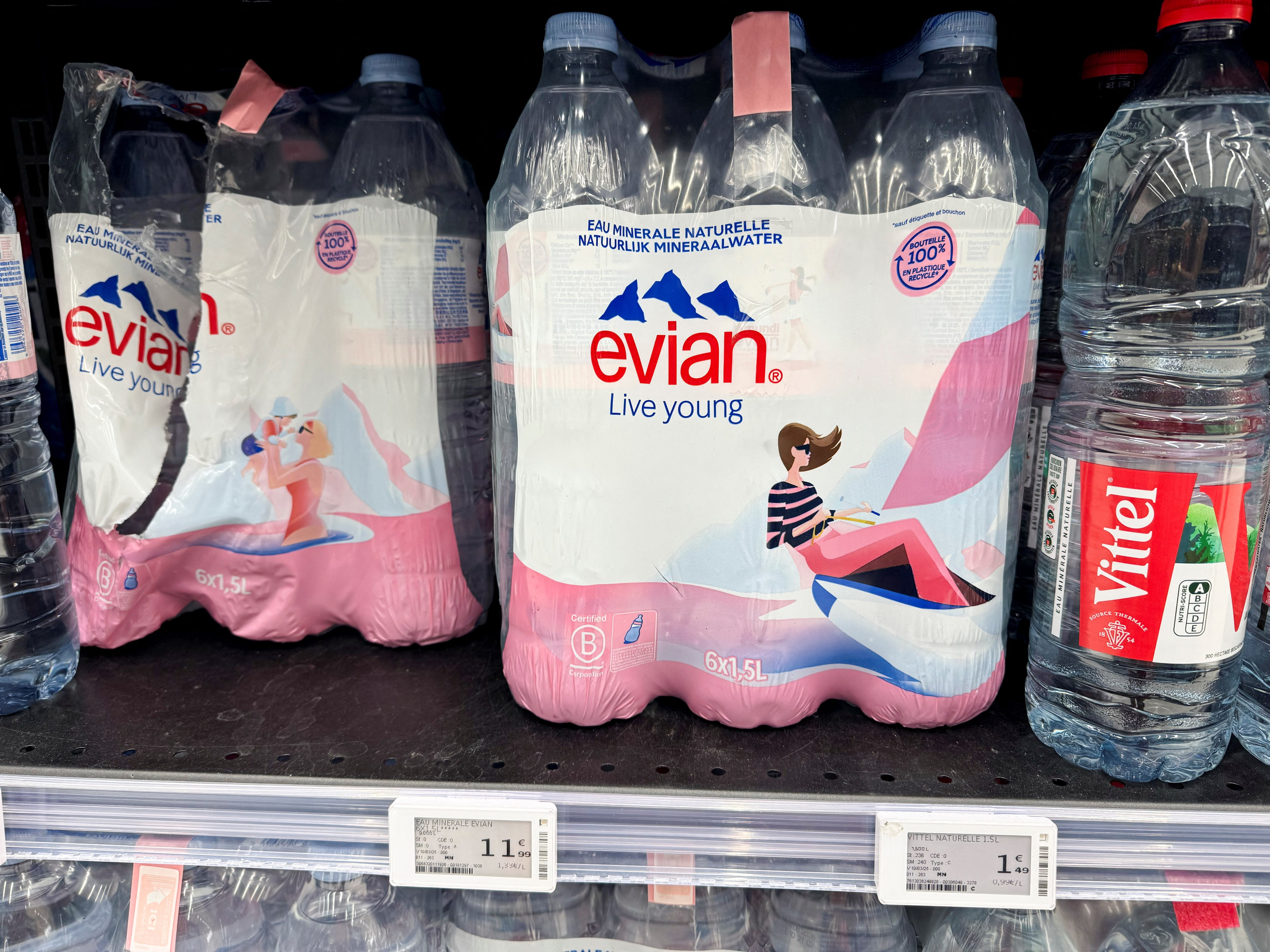 瓶装水在法属加勒比岛马提尼克的一个超市出售,那里价格平均比法国本土高出40%,地点在马提尼克的Le Robert,2025年3月12日。路透社/Mathieu Rosemain每包六瓶1.5升的价格为3.85欧元。巴黎地区同样的E.Leclerc超市显示,价格为1.50欧元。Carrefour的进口Evian价格为11.99欧元,而在本土为3.66欧元。