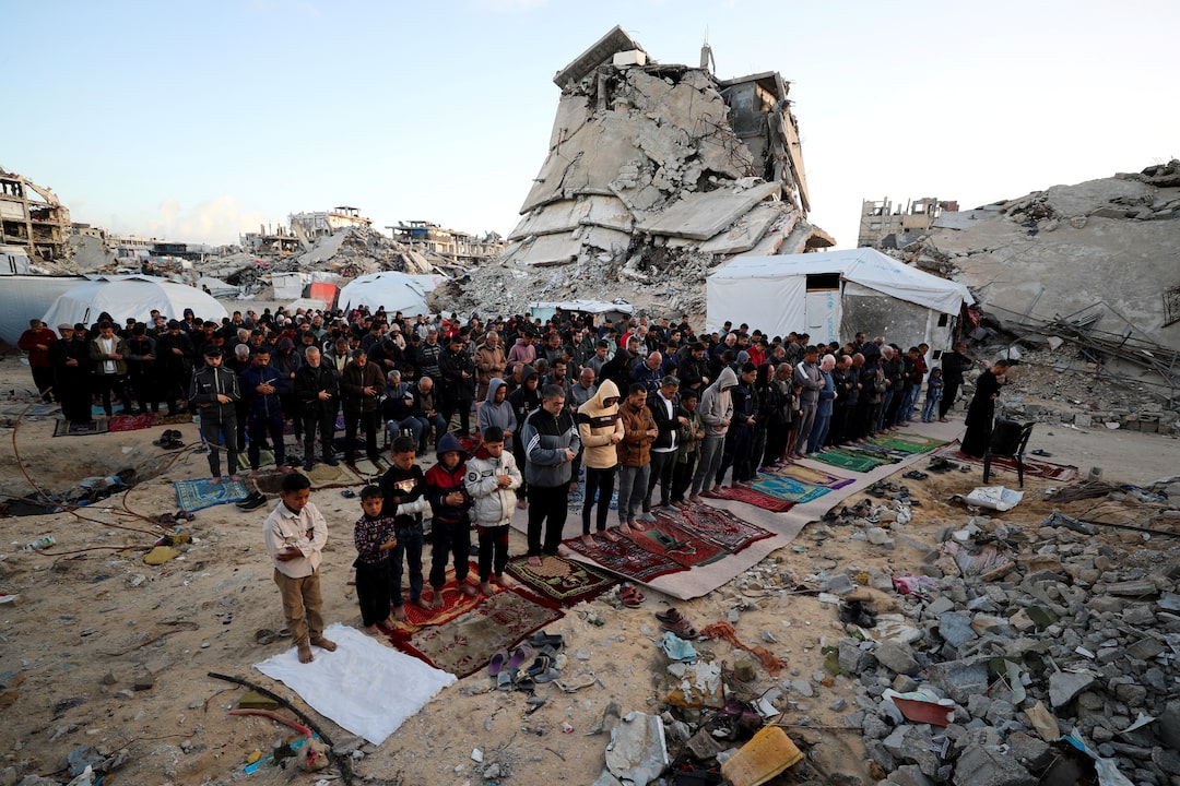 “我们在这里庆祝上帝的仪式,尽管周围是一片废墟和炮声,”在加沙北部的贾巴利亚,米纳塔拉·阿尔-法尔说,那里的大部分地区已被以色列轰炸摧毁。