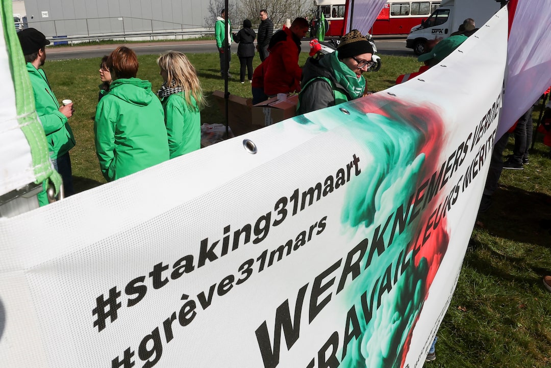 第1项,共6项 一条横幅写着“工人应得尊重”,在比利时布鲁塞尔机场布鲁卡戈物流运输中心附近的抗议活动中,发生在全国罢工当天,2025年3月31日,扎文特姆,布鲁塞尔附近。路透社/伊夫·赫尔曼