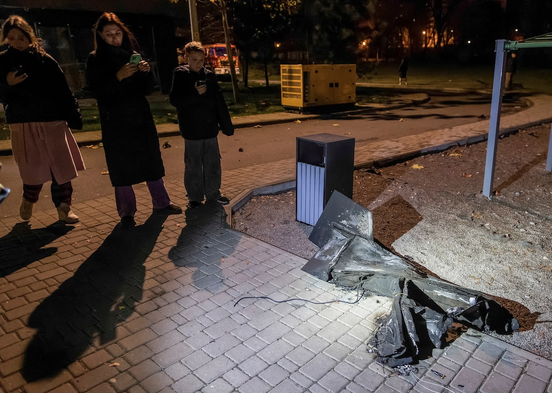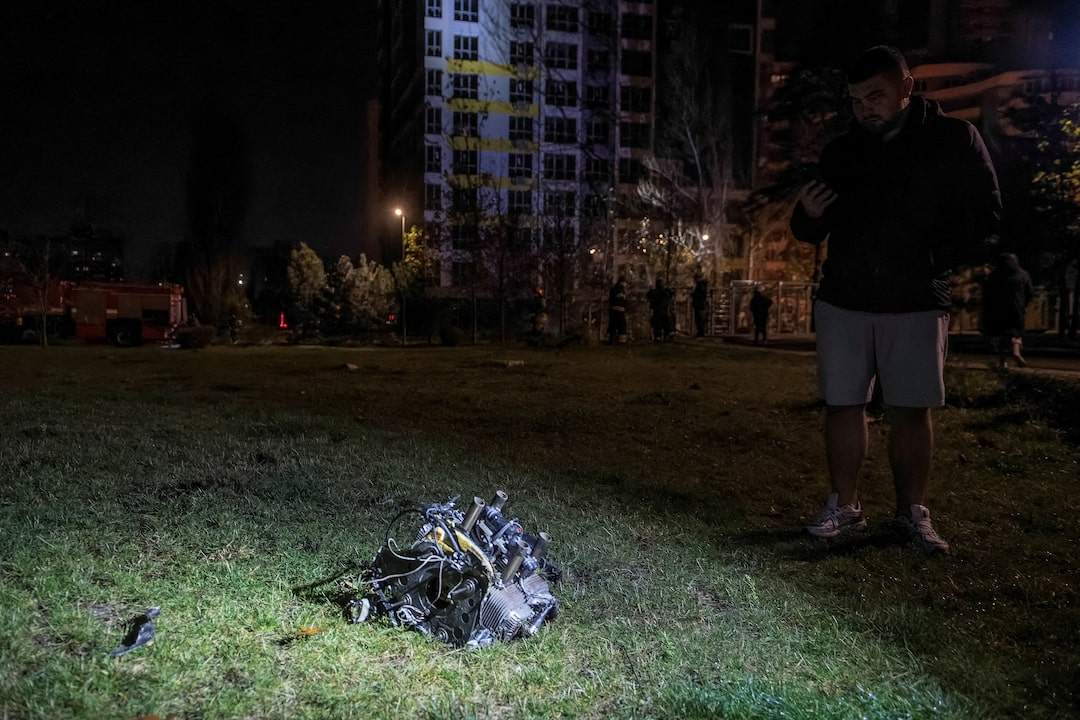 夜间,基辅的多个地点燃起火焰,几波俄罗斯无人机和导弹袭击袭来,照片显示人们在满是瓦砾的街道上蜷缩在一起,外面是他们的公寓楼。