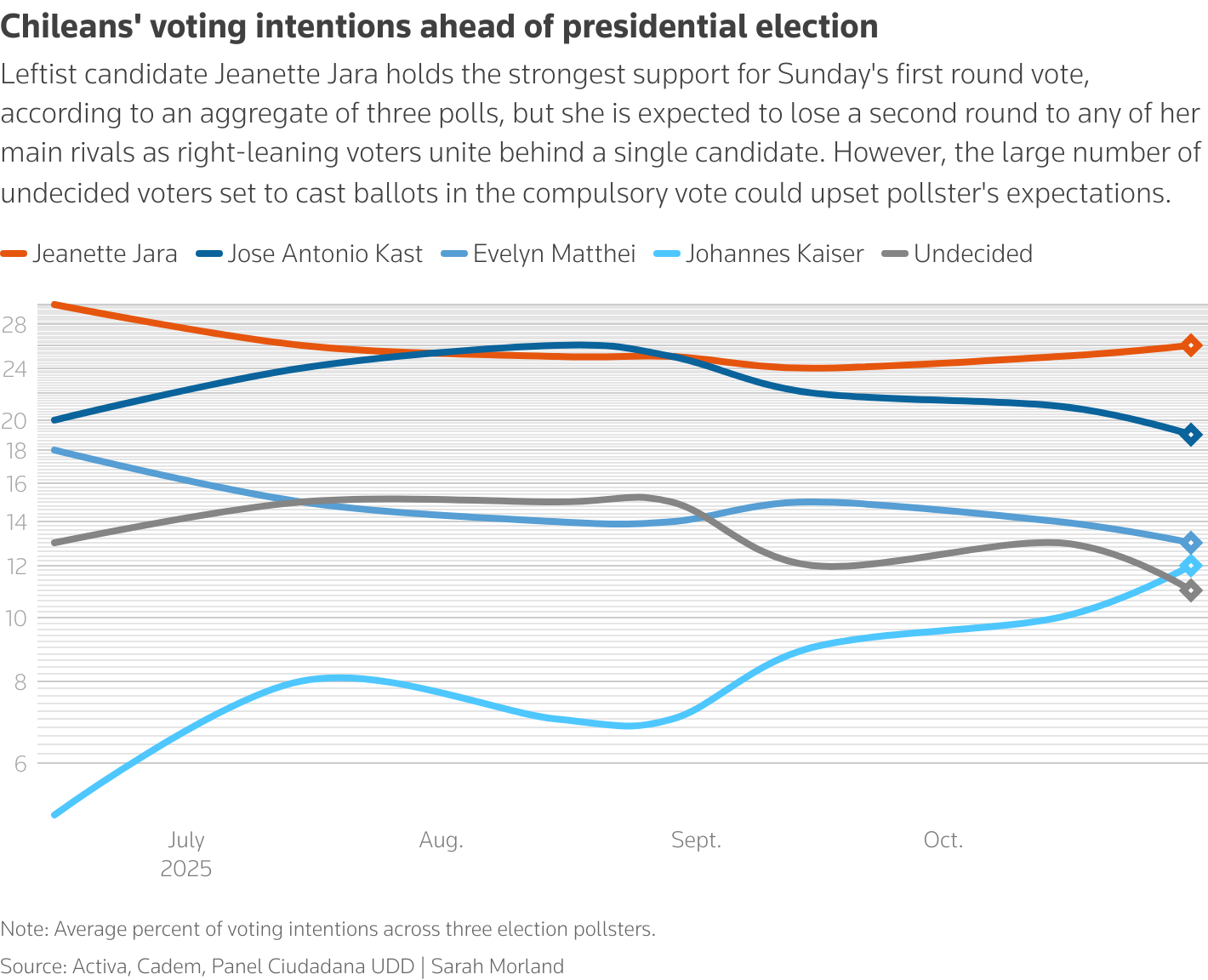 折线图显示自六月以来三家民调机构对四位主要候选人和未决定选民的平均投票意向。