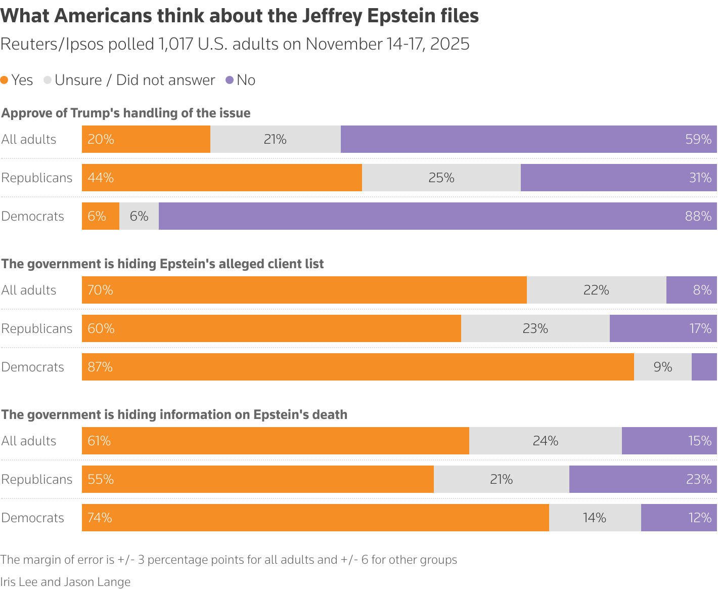 总统看到国会中的共和党同僚 拒绝了他 关于埃普斯坦文件的发布,包括曾经的好朋友 玛乔丽·泰勒·格林。 他与沙特王储穆罕默德·本·萨勒曼的白宫会议被广泛视为失误,因为 他对2018年沙特特工杀害记者贾马尔·卡舒吉的辩解。 一家联邦法院 推翻了他支持的德克萨斯州重新划分选区的地图。 根据一项新的路透社/Ipsos民调,他的受欢迎程度在第二任期内达到了新低,因为高消费成本持续困扰着他的政府。报告广告但是,嘿,至少感恩节前火鸡价格下降了!这是个好消息。(但并不全是好消息。请看下面。)