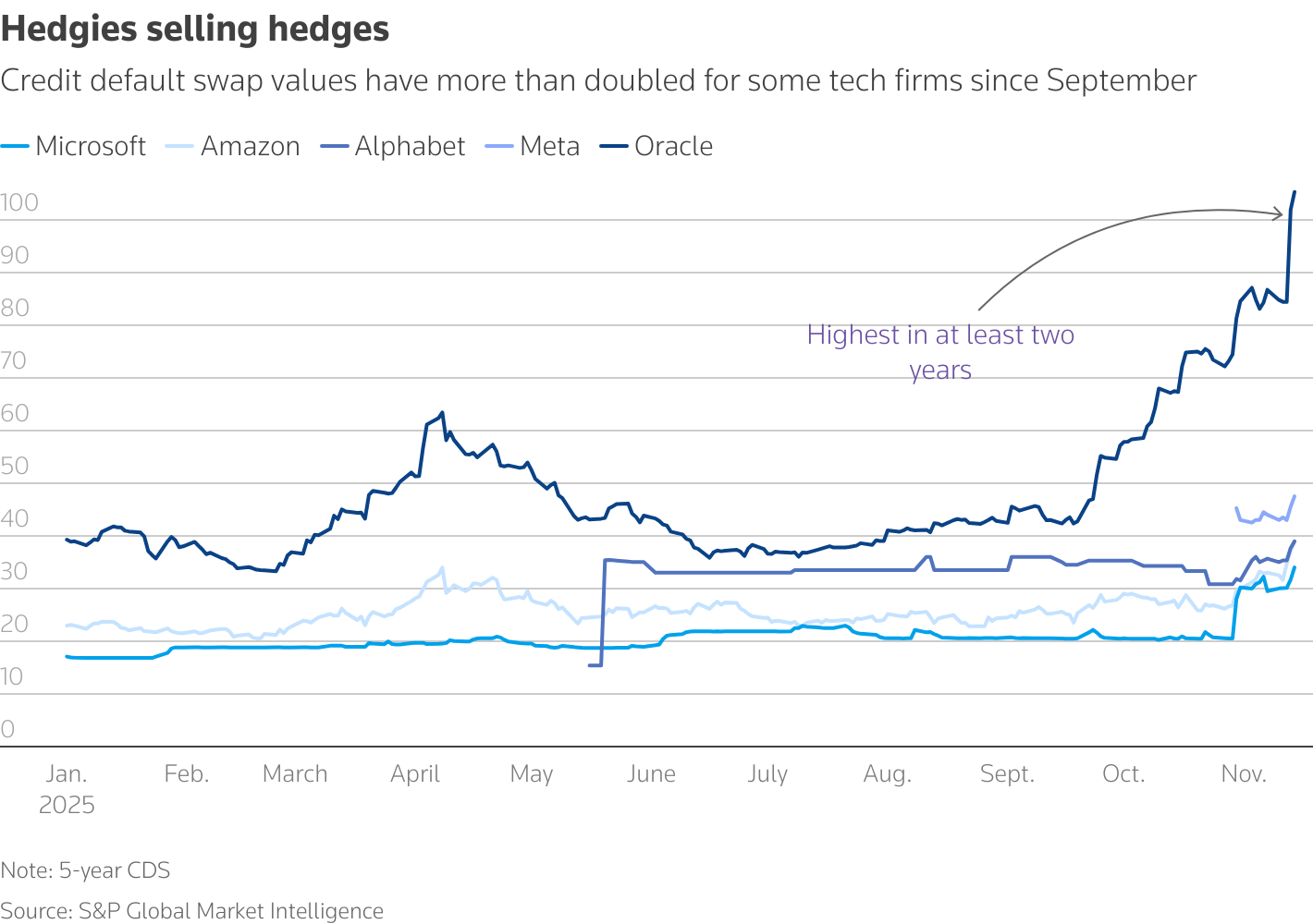 在美国大型科技公司专注于人工智能的750亿美元投资级债务在九月和十月进入市场后,保障甲骨文违约的五年期信用违约掉期的成本在一个月内上涨了44%,达到87个基点,数据来自Refinitiv。