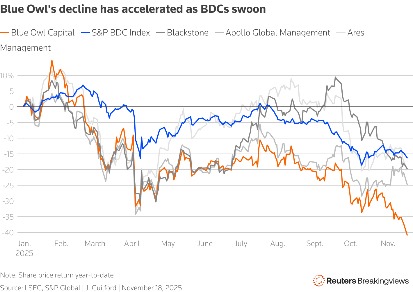 一张显示蓝猫与同行及S&P BDC指数年初至今股价表现的图表